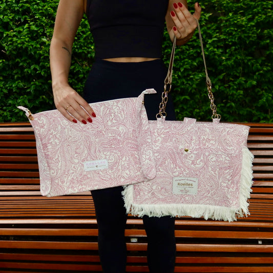 Bolsa Katrin Arabesque Rosa com Alças de Corrente e Couro Dourado