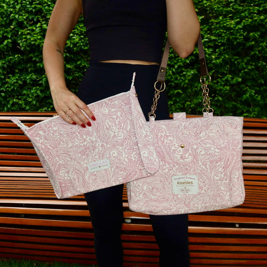 Bolsa Katrin Arabesque Rosa com Alças de Corrente e Couro Caramelo