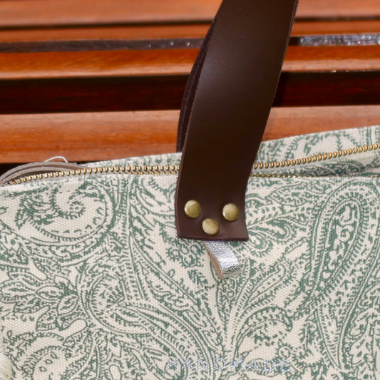 Bolsa Wallow Arabesque Verde com Alça de Couro Marrom Escuro com Zíper
