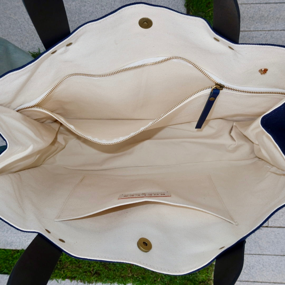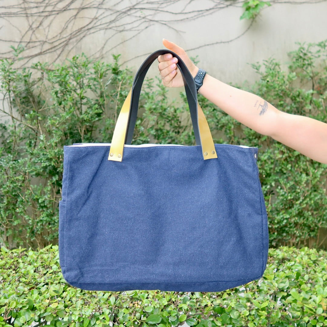 Bolsa grande estilo sacola no modelo Wallow na cor marinho, com estampa em silk dourado, e alças de couro legítimo em dourado.