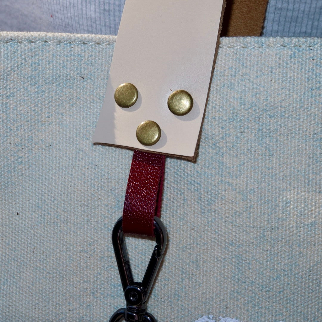 Bolsa grande estilo sacola no modelo Wallow na cor azul, com estampa em silk branco e vinho, e alças de couro legítimo em off white.