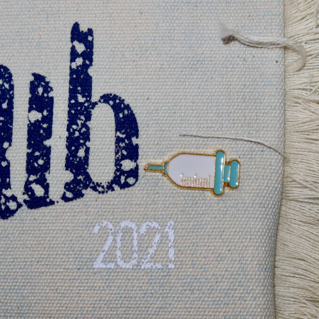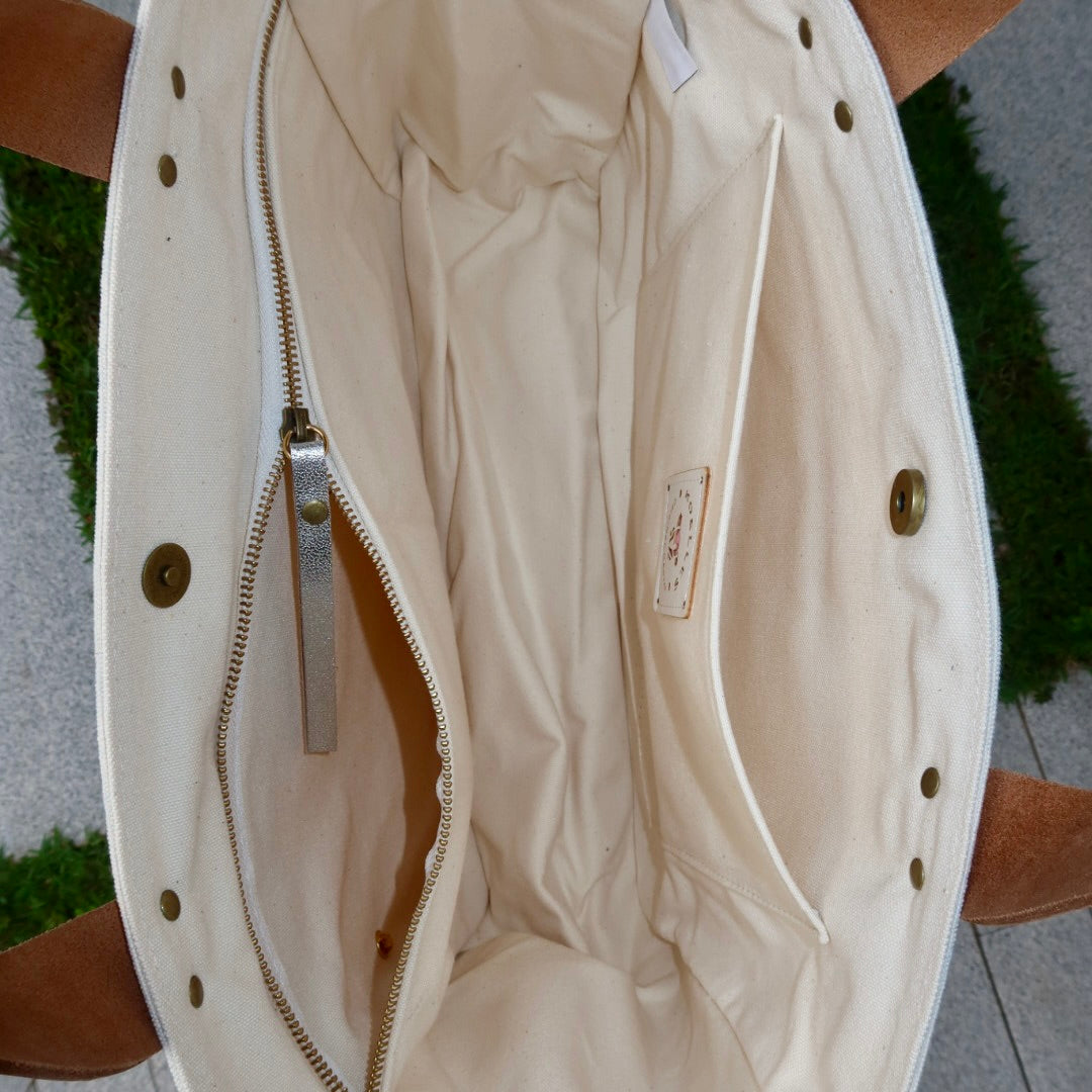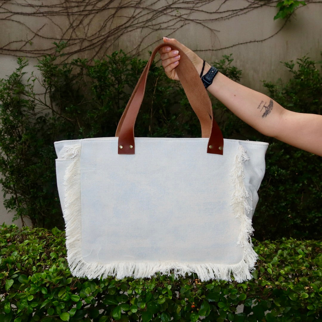 Bolsa média em lona de algodão estilo tote no modelo Nuna na cor azul, com estampa em silk marinho, e alças de couro legítimo em marrom.