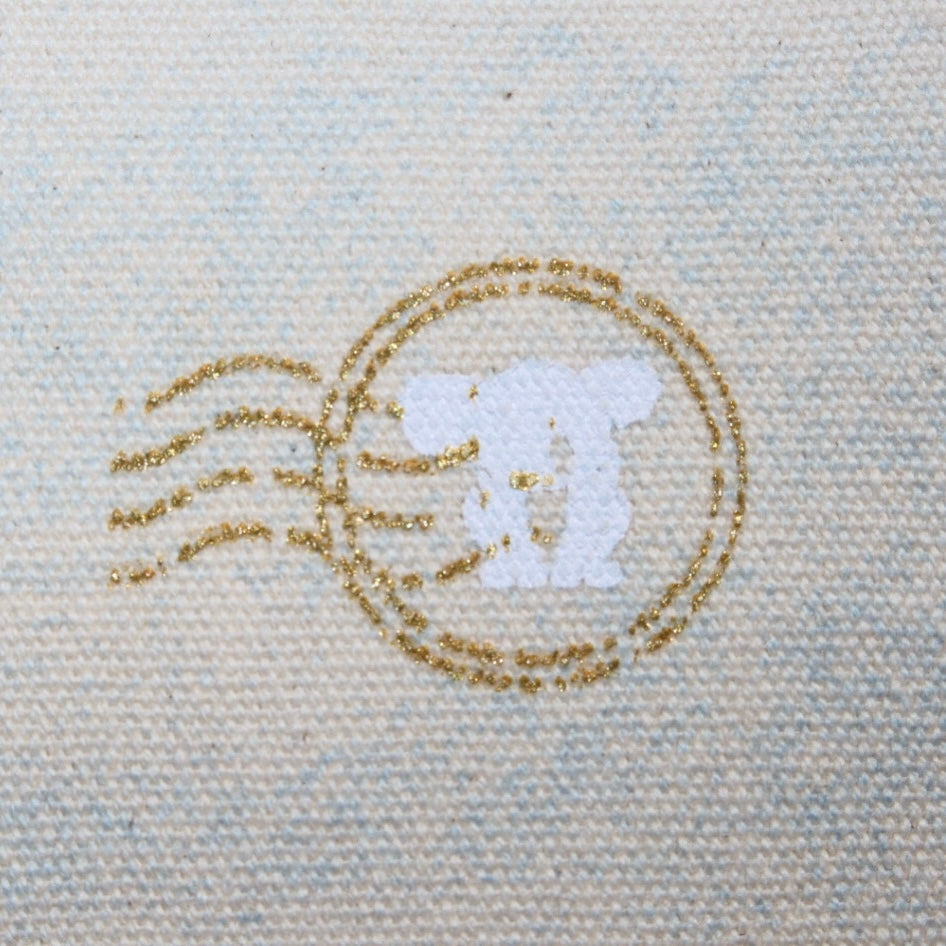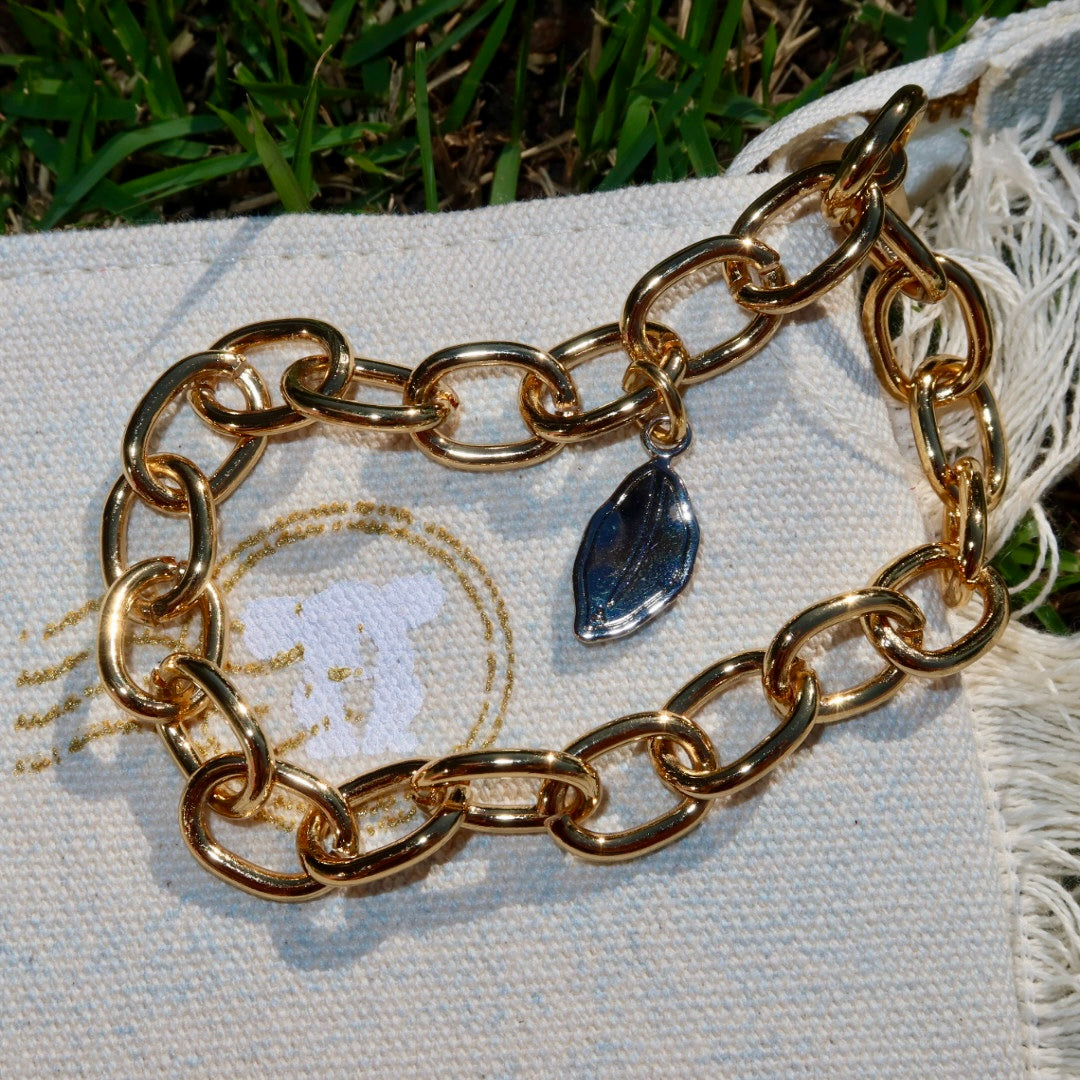 Necessaire em lona de algodão na cor azul, com franjas de algodão e estampa em dourado e branco. Contém uma corrente de metal dourado que não oxida com charms variados.