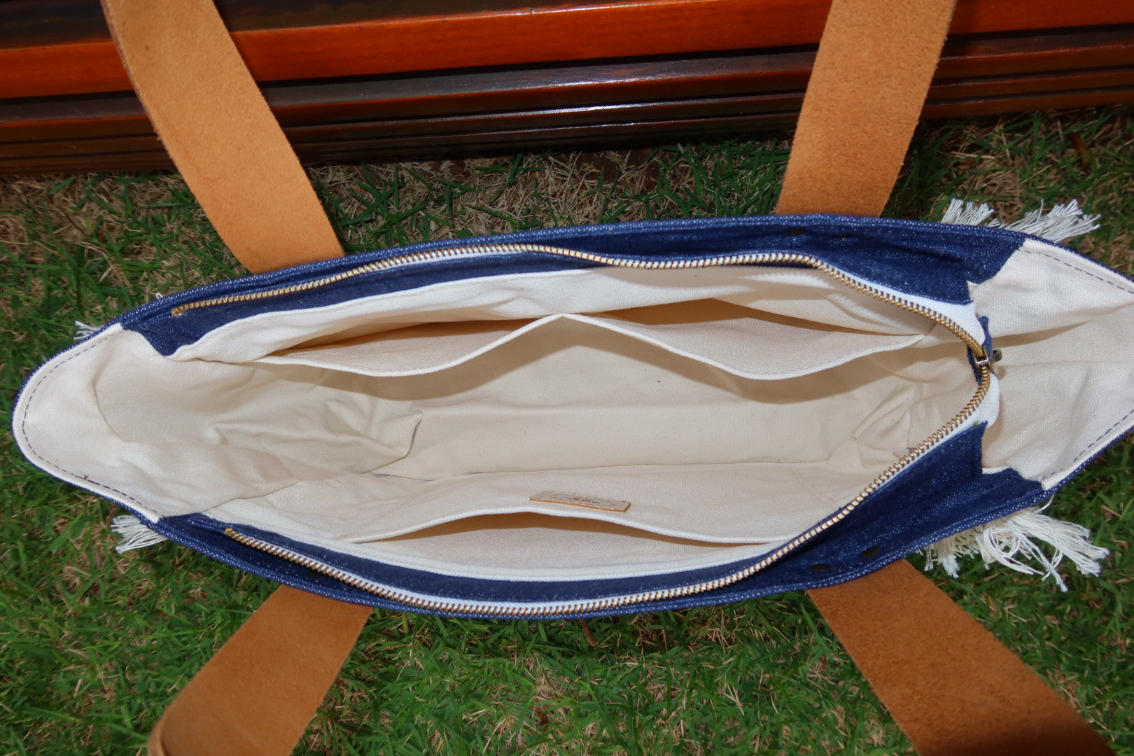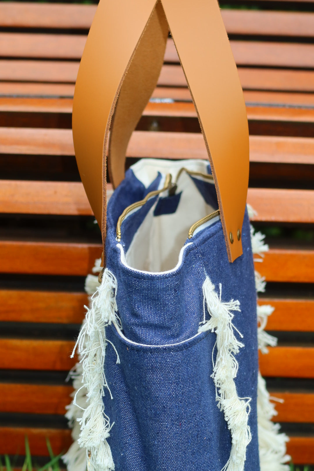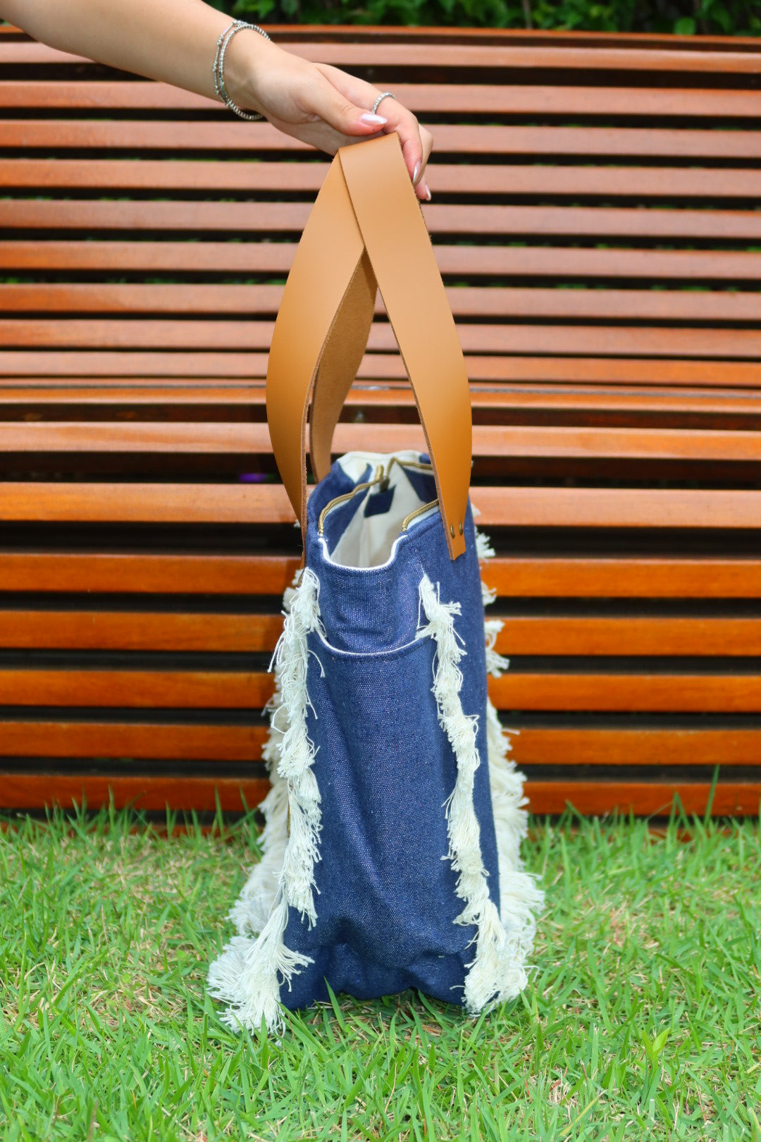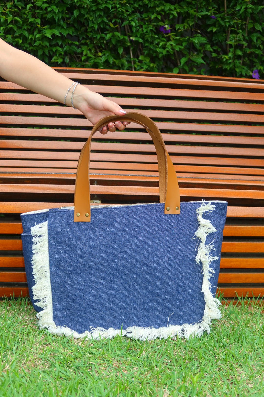 Bolsa média em lona de algodão estilo tote no modelo Nuna na cor jeans, com estampa em silk dourado e alças de couro legítimo em caramelo.