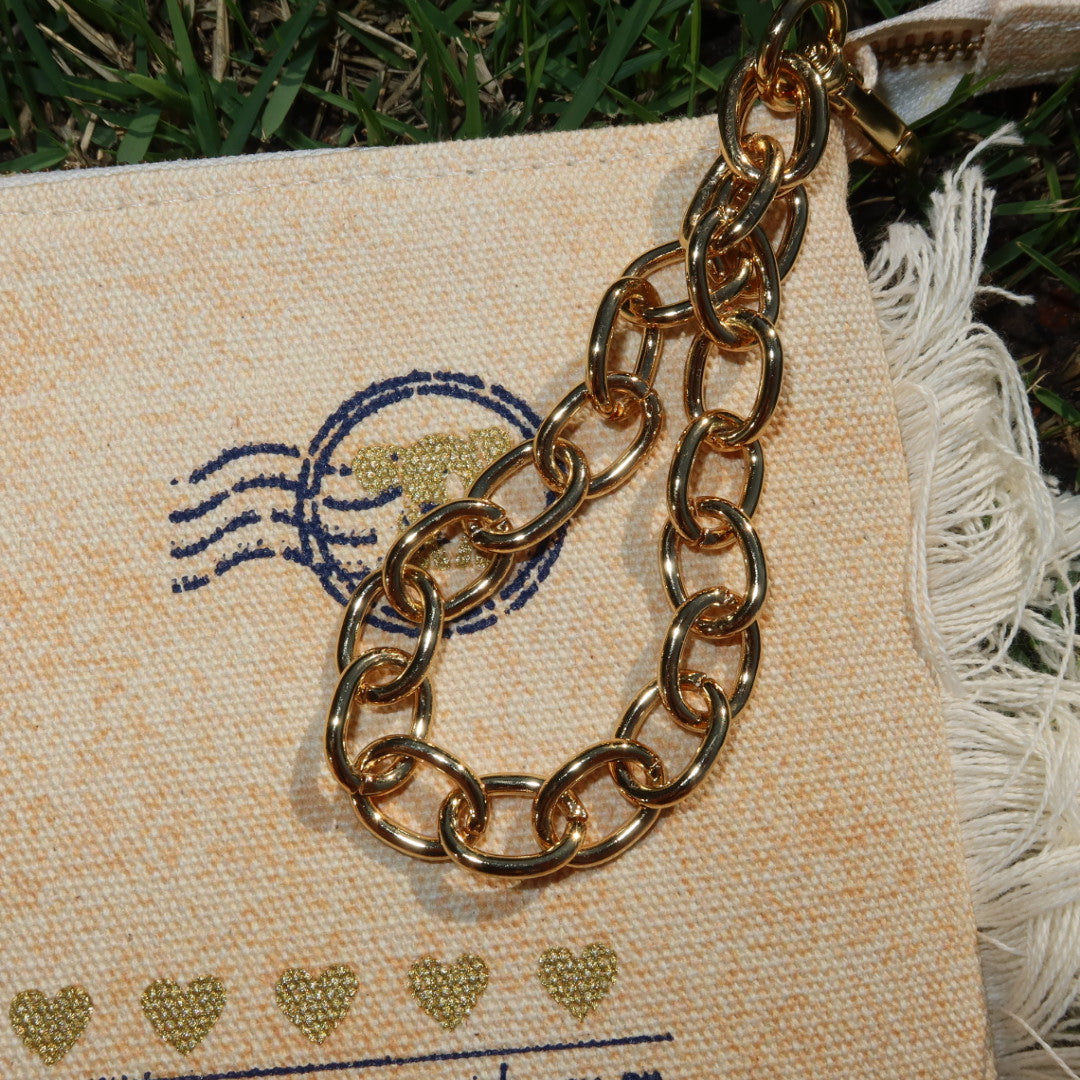 Necessaire em lona de algodão na cor laranja, com franjas de algodão e estampa em dourado e marinho. Contém uma corrente de metal dourado que não oxida com charms variados.