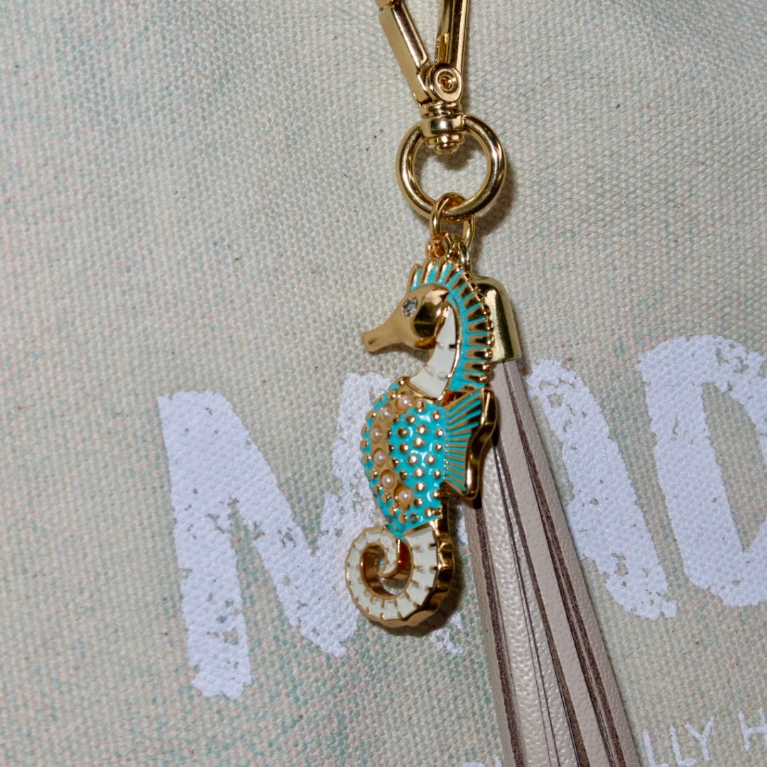 Bolsa grande estilo sacola no modelo Wallow na cor aqua, com estampa em silk branco, e alças de couro legítimo em marrom com acabamento em vinil.