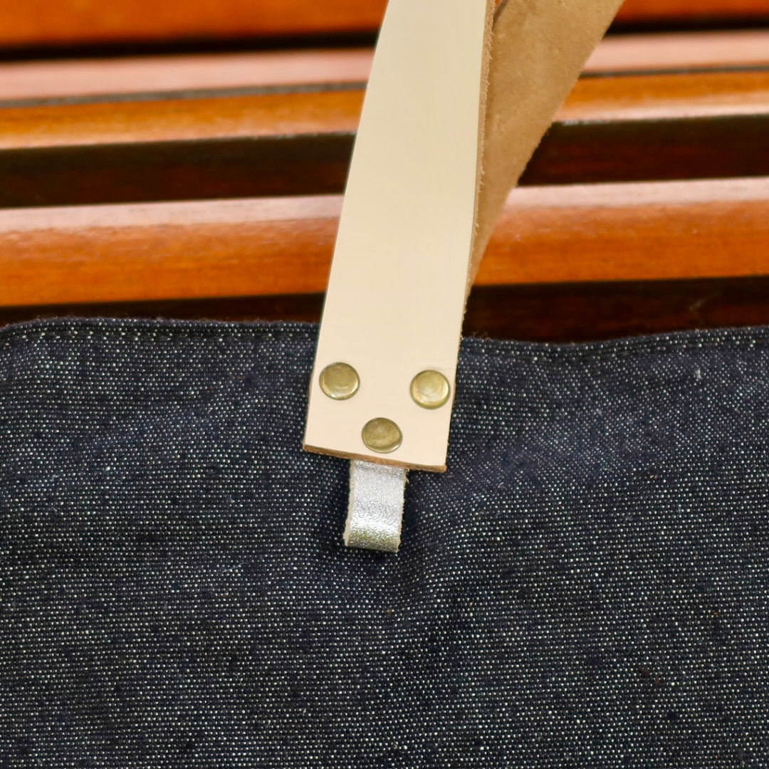 Bolsa grande estilo sacola no modelo Wallow na cor jeans preto, com estampa em silk branco, e alças de couro legítimo em bege.