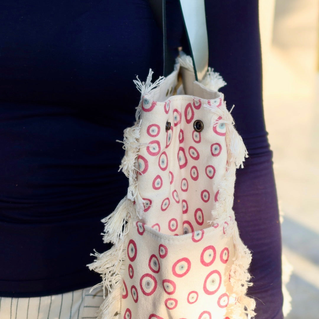 Bolsa grande estilo sacola no modelo Wallow em lona crua, com estampa de olho grego rosa e alças de couro legítimo em prata.