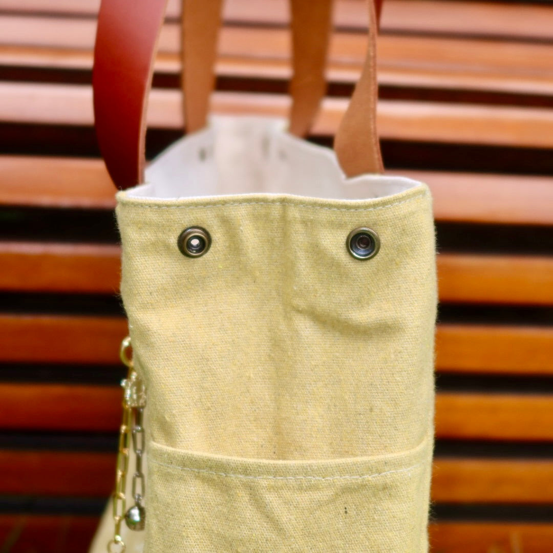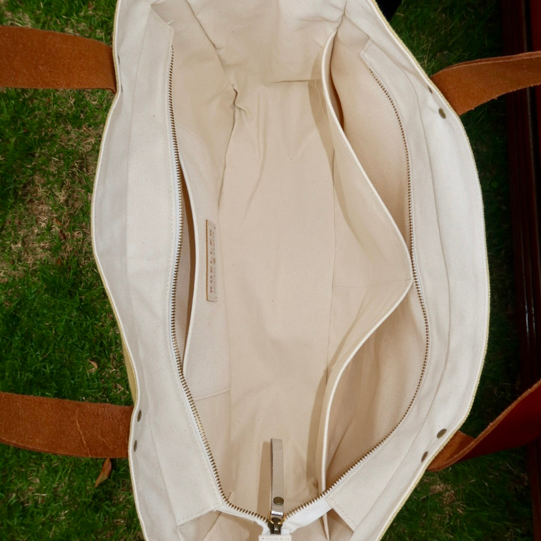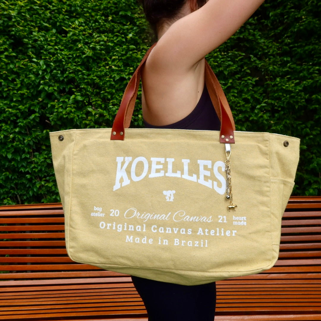 Bolsa grande estilo sacola no modelo Wallow na cor mostarda, com estampa em silk branco, e alças de couro legítimo em marrom.