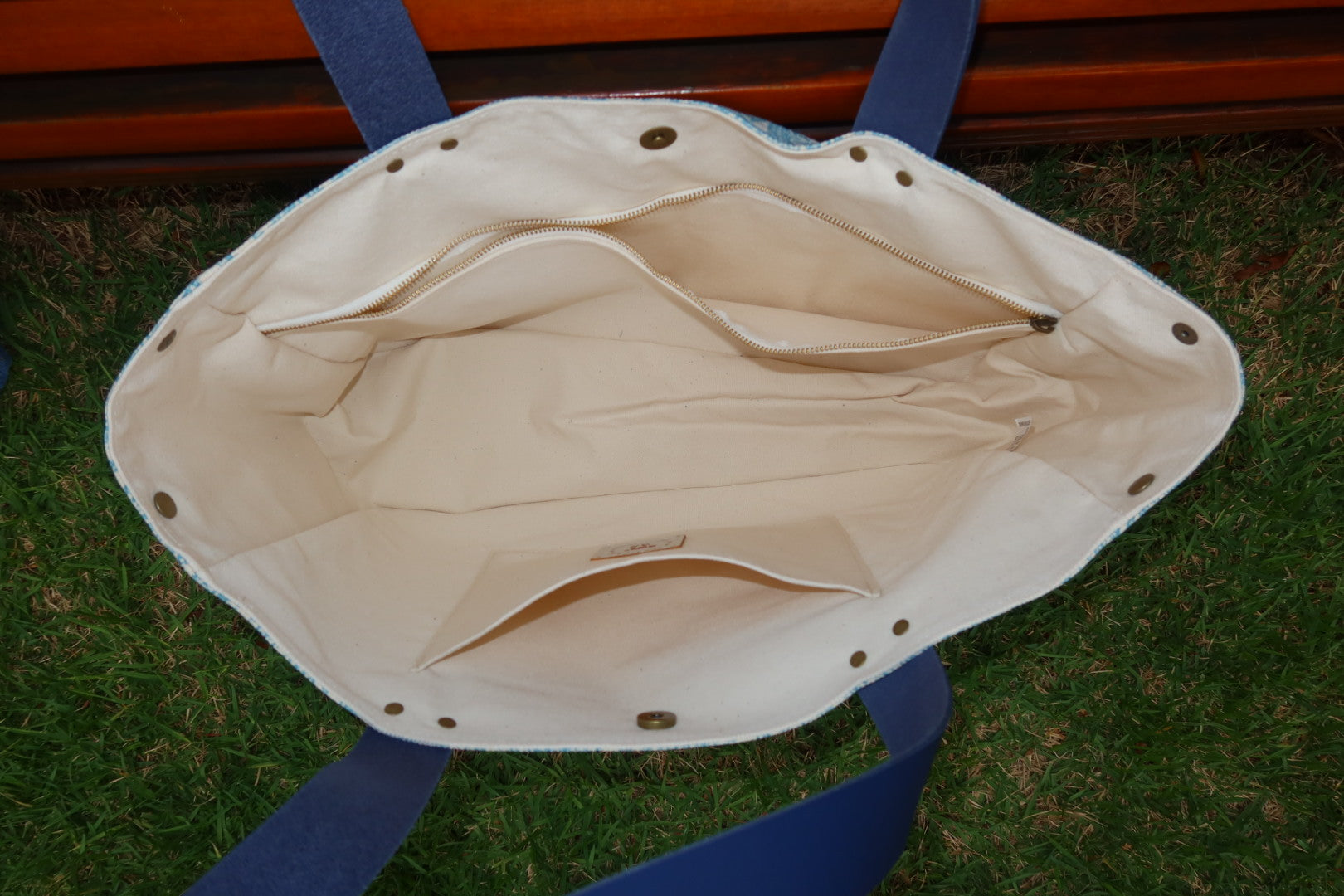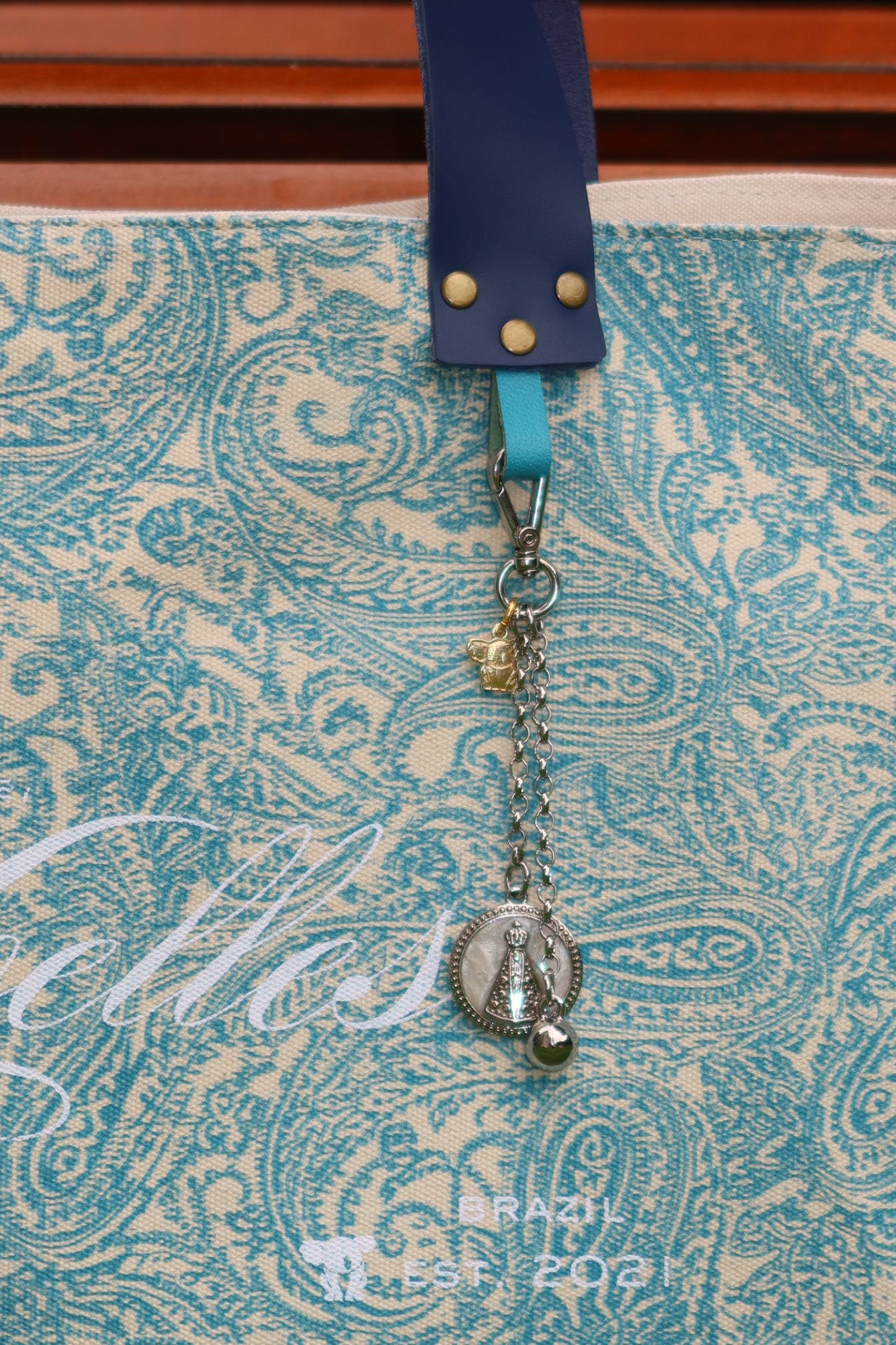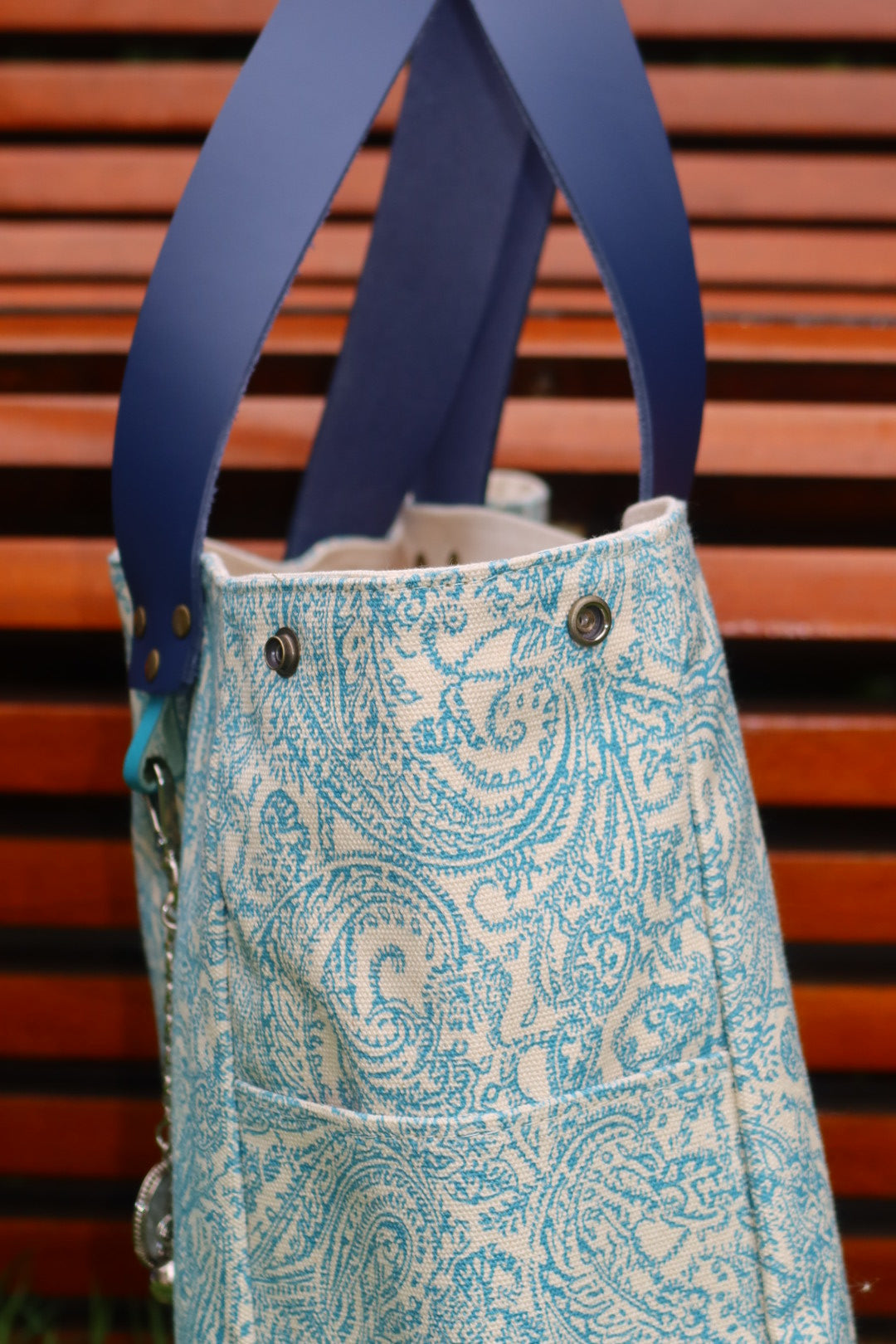 Bolsa grande estilo sacola no modelo Wallow na cor arabesque turquesa com estampa em silk branco, e alças de couro legítimo em marinho.