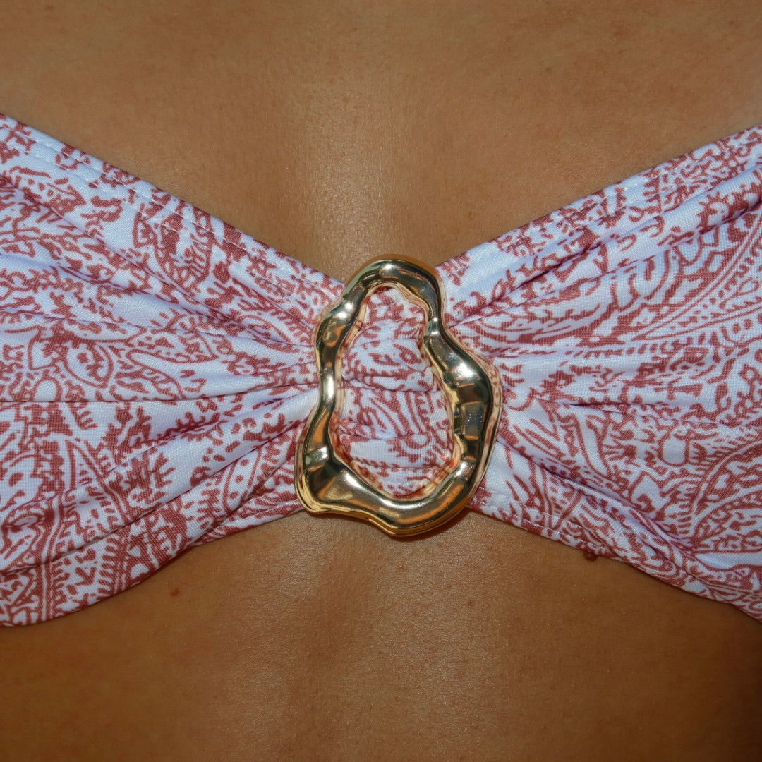 Biquini no modelo tomara-que-caia, feito em lycra na estampa arabesque na cor terracotta. Contém um detalhe dourado grande no centro da parte de cima do biquíni e calcinha com elástico de tamanho mais largo, que pode ser dobrado na hora de tomar sol!