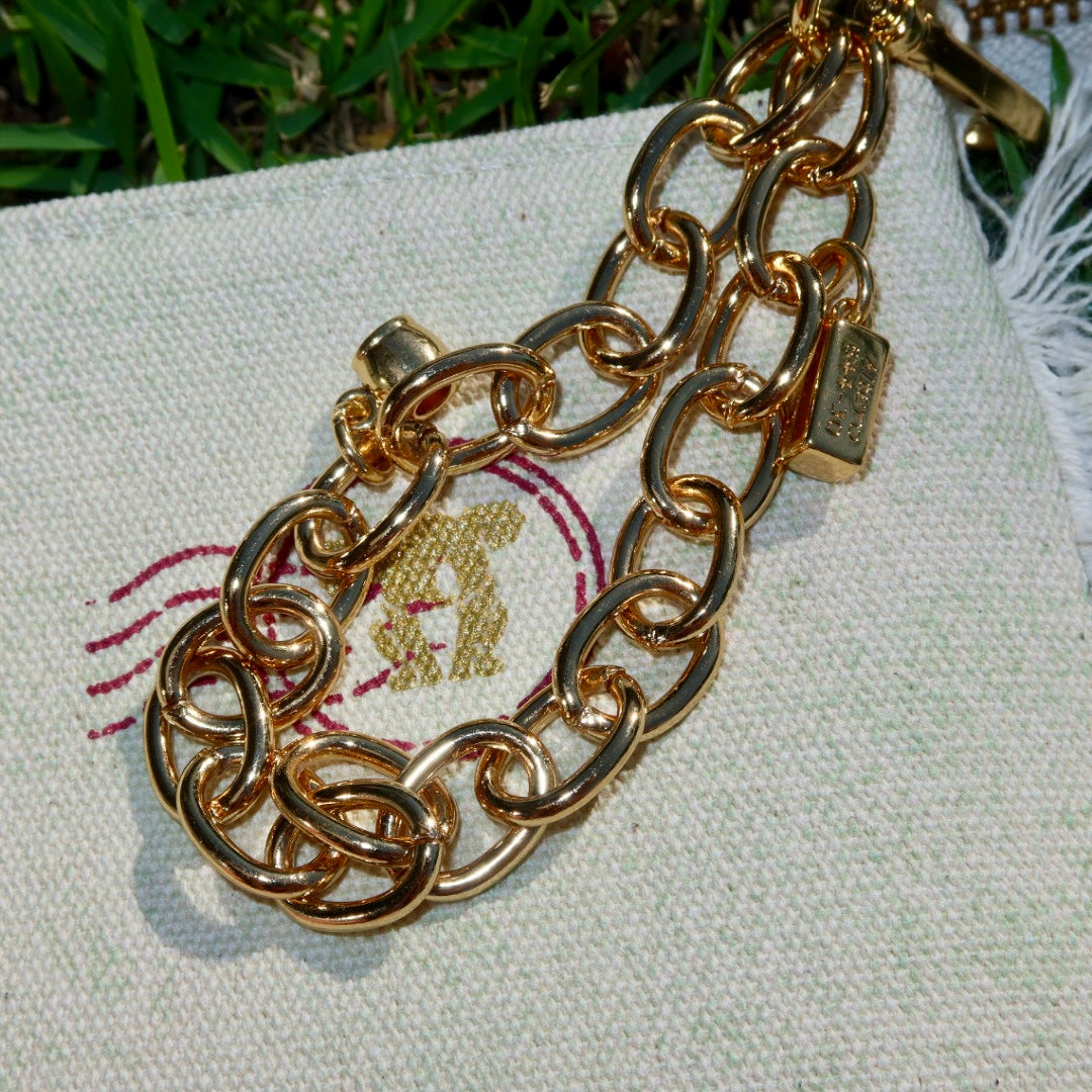 Necessaire em lona de algodão na cor verde, com franjas de algodão e estampa em dourado e vinho. Contém uma corrente de metal dourado que não oxida com charms variados.