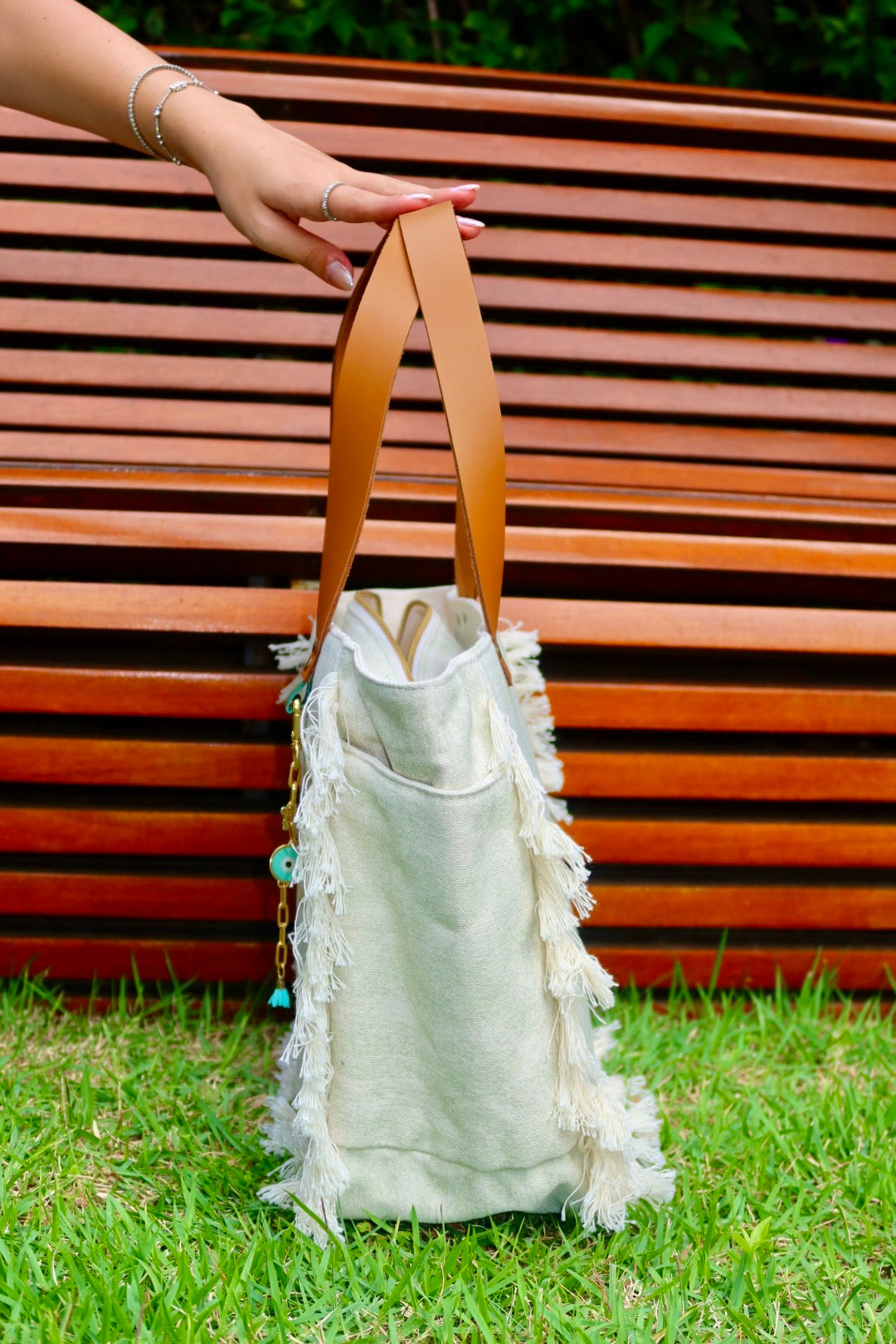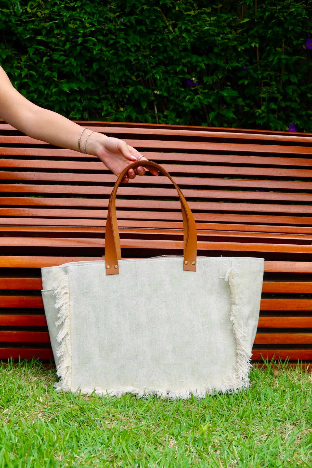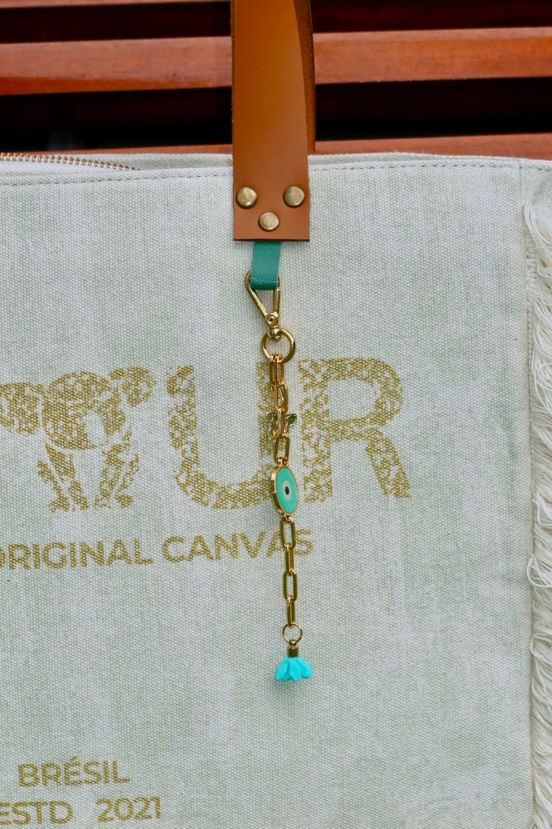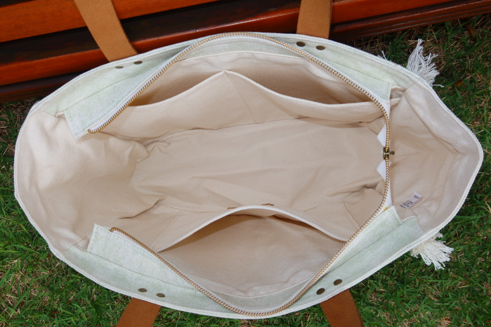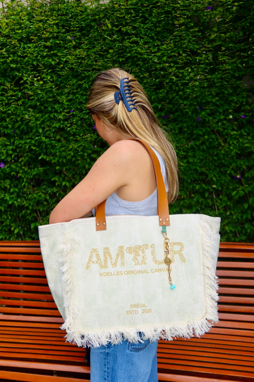 Bolsa média em lona de algodão estilo tote no modelo Nuna na cor verde, com estampa em silk dourado e alças de couro legítimo em caramelo.