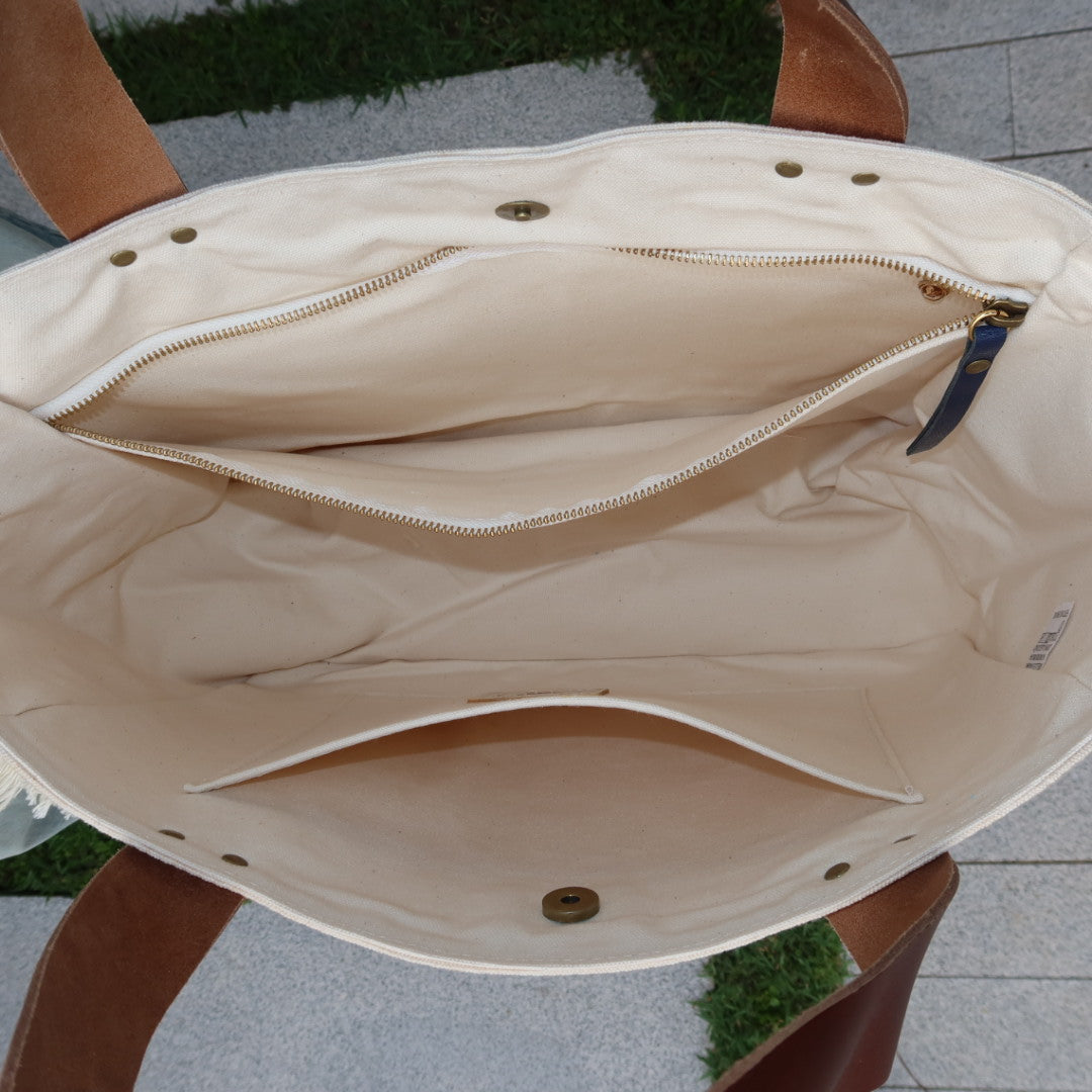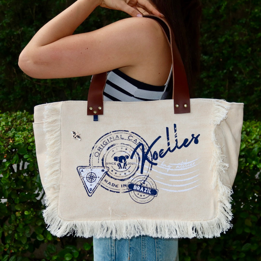 Bolsa média em lona de algodão estilo tote no modelo Nuna na cor bege, com estampa em silk branco e marinho, e alças de couro legítimo em marrom escuro.