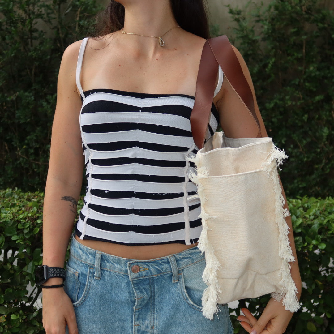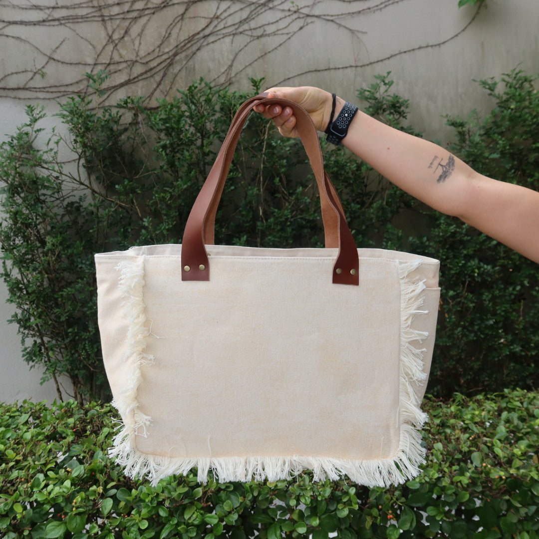 Bolsa Nuna Bege com Alças de Couro Marrom Escuro