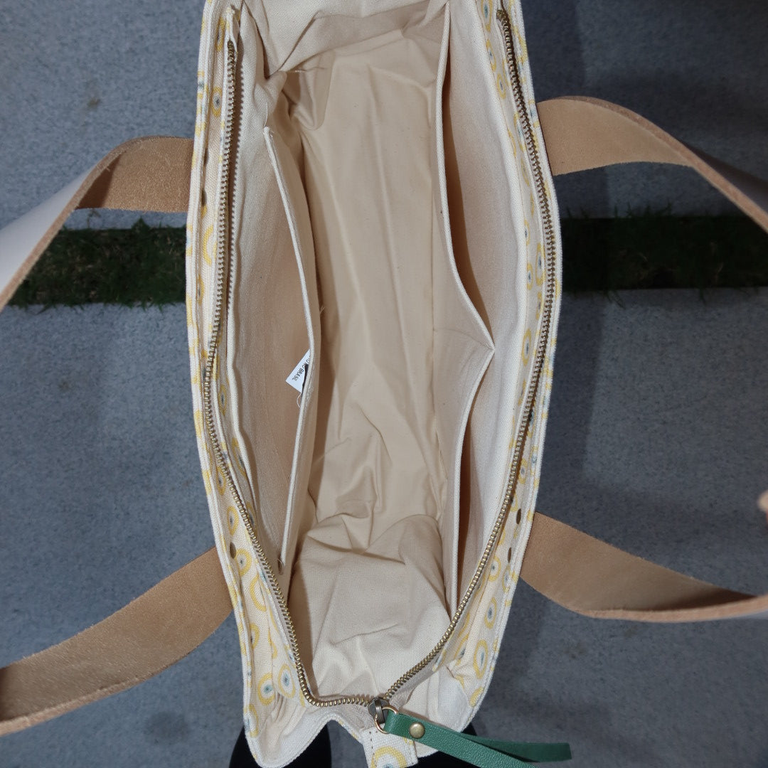 Bolsa média em lona de algodão estilo tote no modelo Nuna na estampa de olhinho grego em amarelo com alças de couro legítimo em off white.