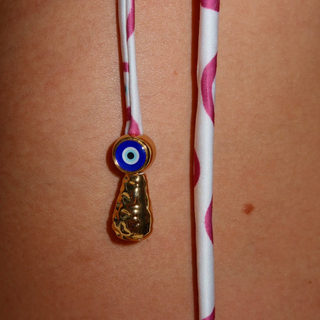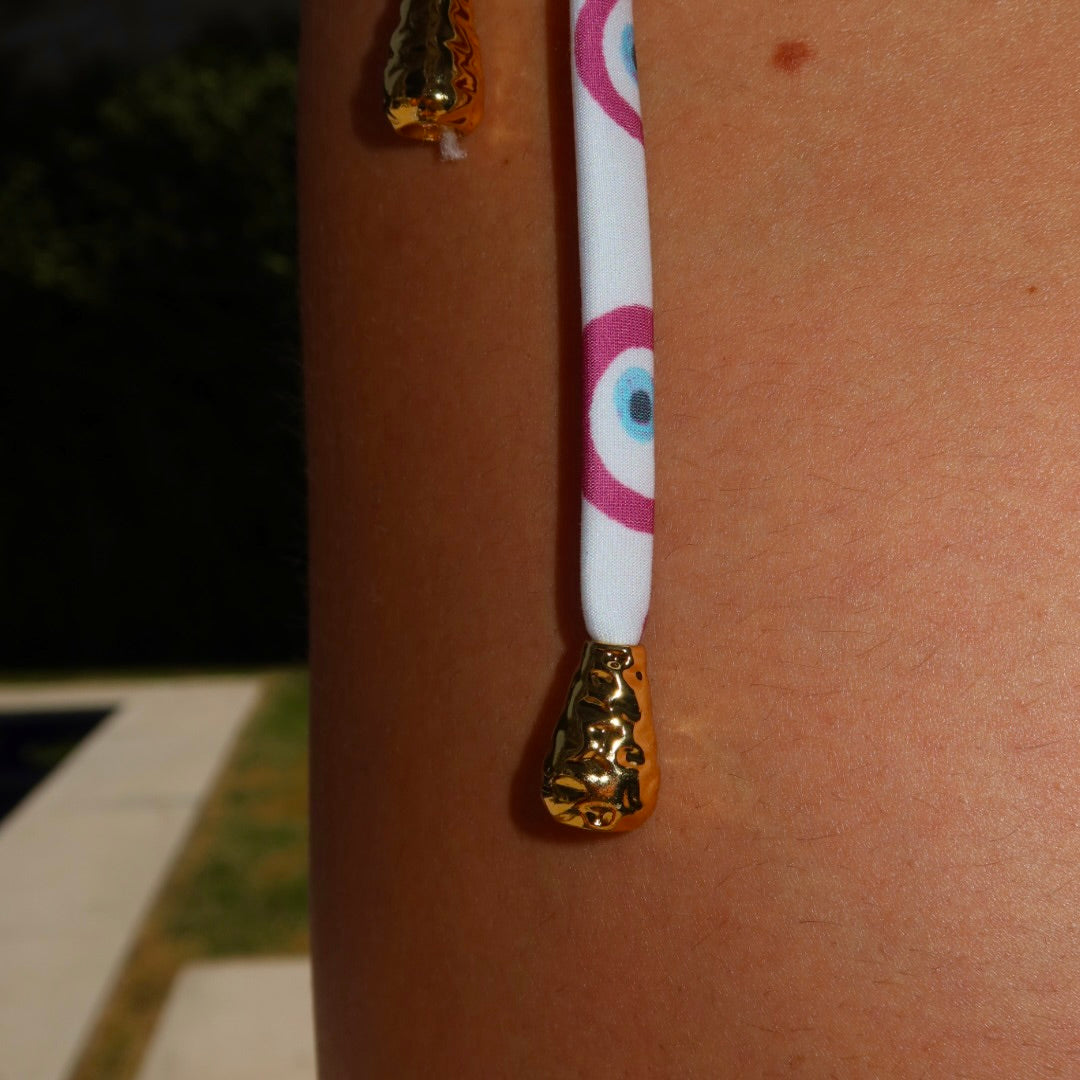 Biquini no modelo cortina com top em alça reta, que é segurada nas costas invés de no pescoço. Feito em lycra na estampa de olhinho na cor rosa. Contém duas miçangas de cada lado na amarração da calcinha.