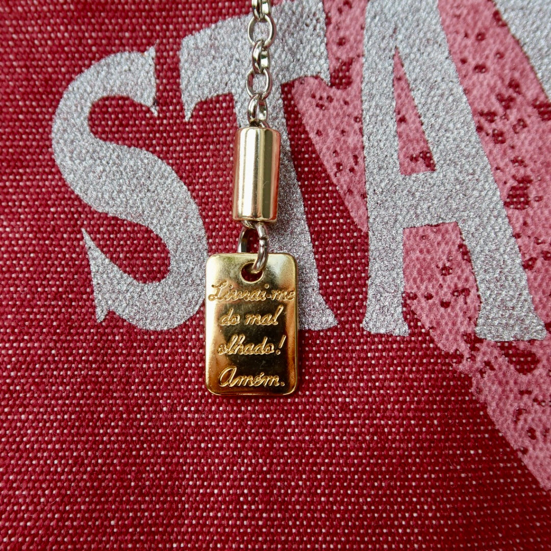 Contém 2 bolsos internos, um deles com fechamento em zíper, e um bolso externo lateral. Fechamento por botão de imã.