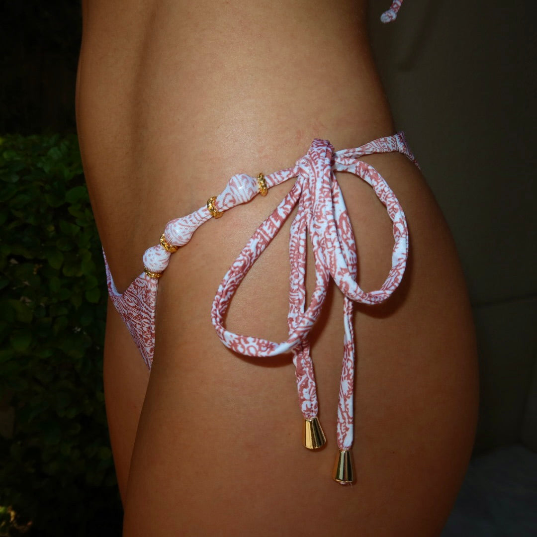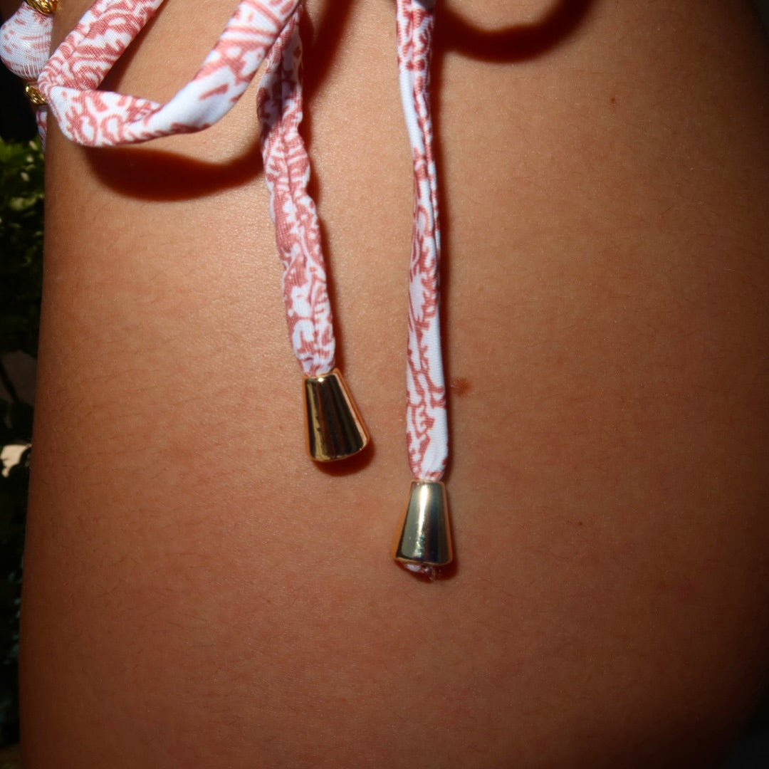 Biquini clássico no modelo cortina, feito em lycra na estampa arabesque na cor terracotta. Contém detalhes de bolinha com acabamento em dourado tanto na parte de cima, em ambas as laterais, quanto na parte de baixo, também em ambas as laterais. Amarração em lacinho ajustável da sua preferência!