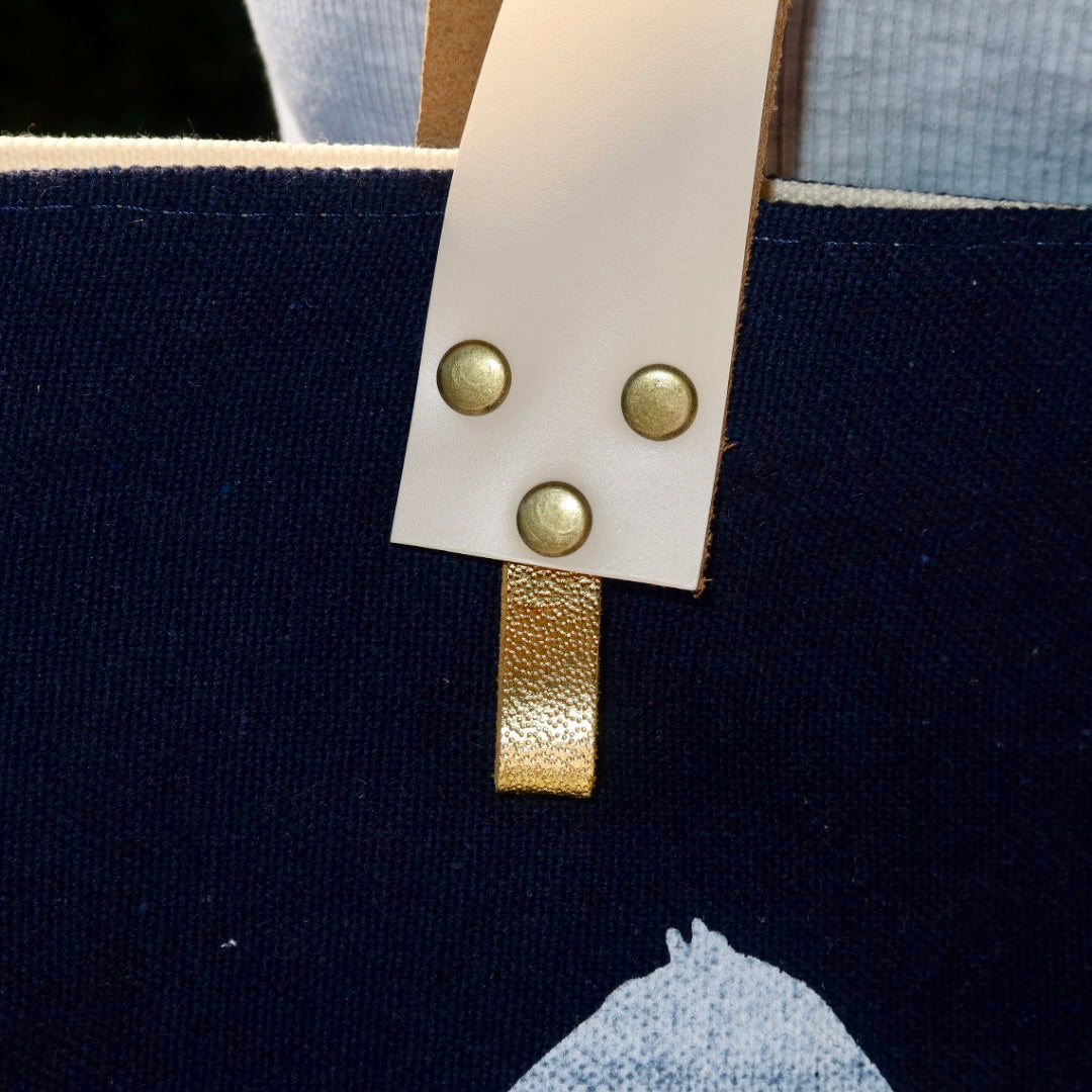 Bolsa grande estilo sacola no modelo Wallow na cor marinho, com estampa em silk branco e dourado, e alças de couro legítimo em off white.