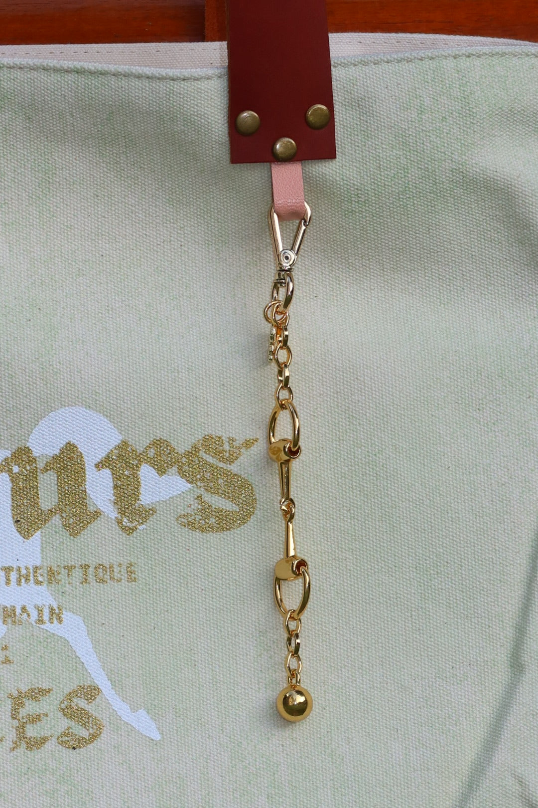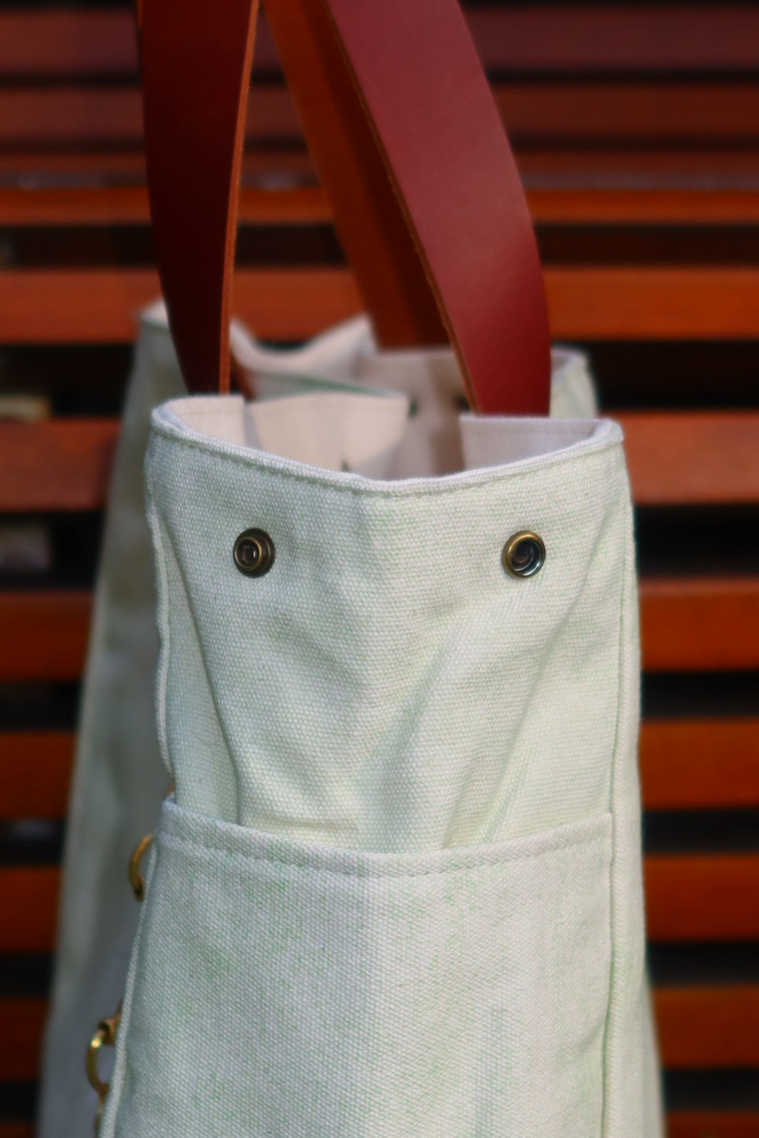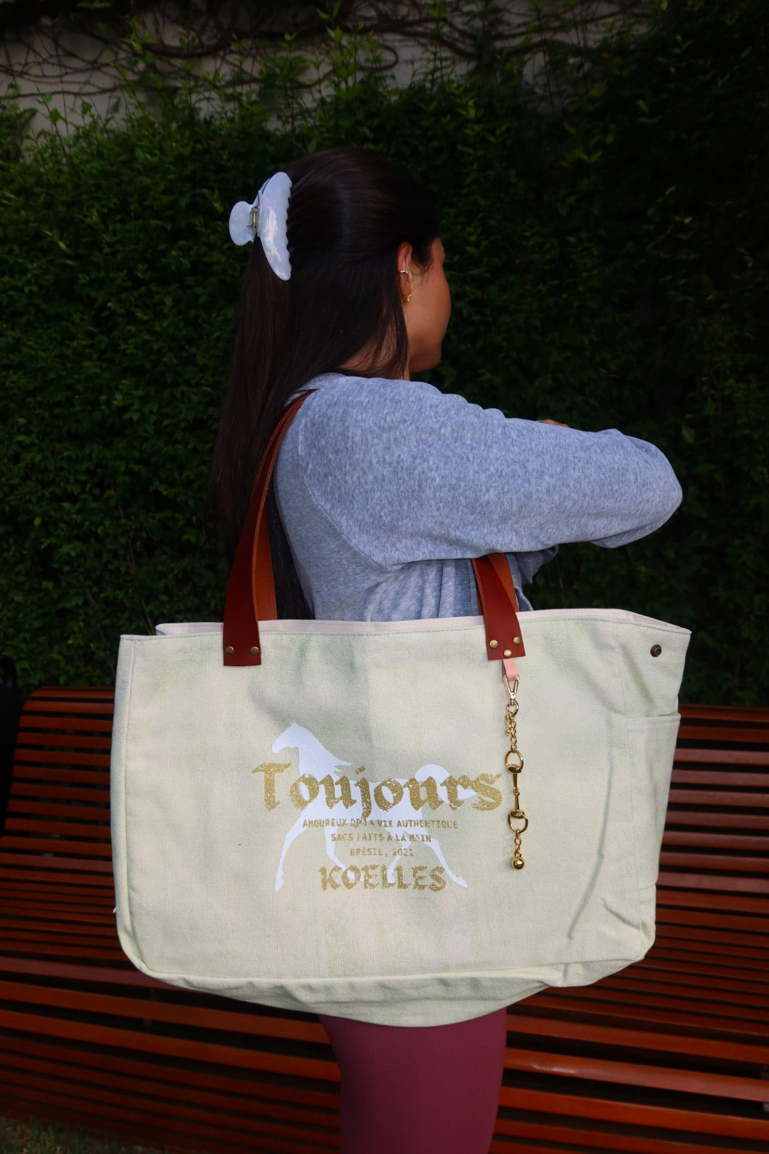 Bolsa grande estilo sacola no modelo Wallow na cor verde, com estampa em silk branco e dourado, e alças de couro legítimo em marrom.