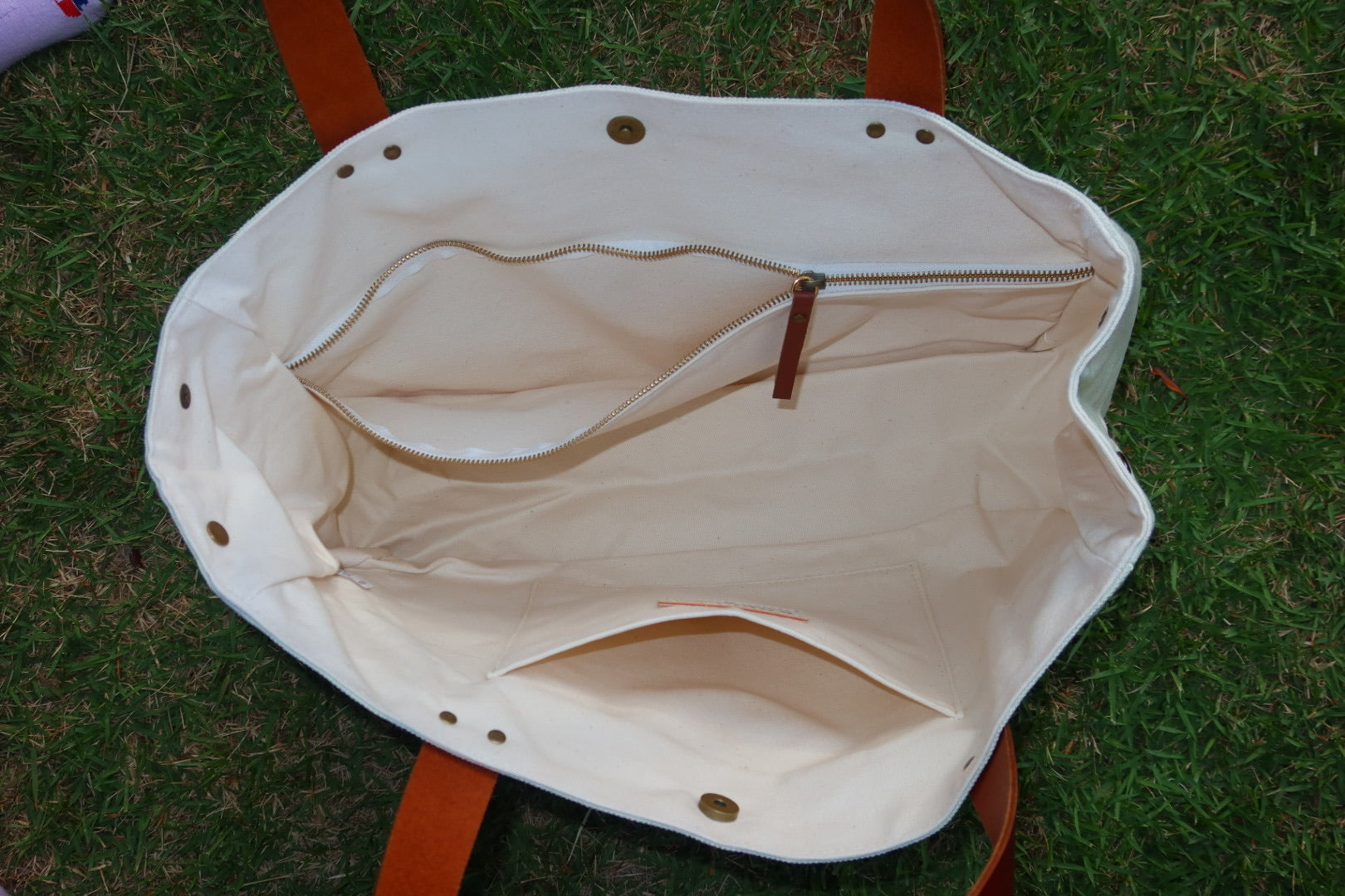 Contém 2 bolsos internos, um deles com fechamento em zíper, e um bolso externo lateral. Fechamento por botão de imã.