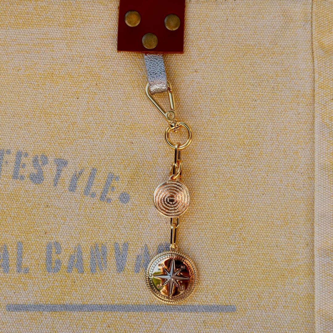 Bolsa média em lona de algodão estilo tote no modelo Nuna na cor amarelo, com estampa em silk prata e alças de couro legítimo em marrom.