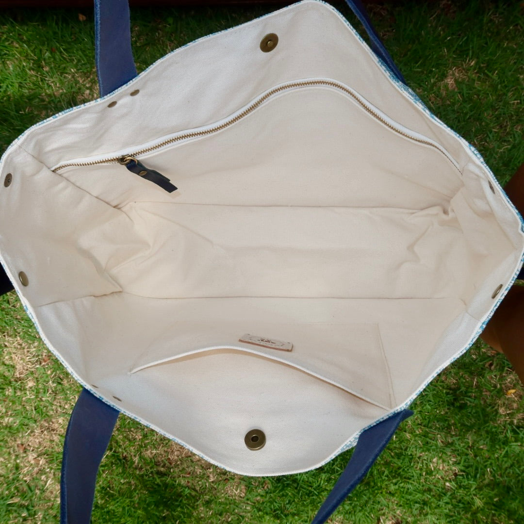 Bolsa grande estilo sacola no modelo Wallow na cor arabesque turquesa, com estampa em silk prata, e alças de couro legítimo em marinho.