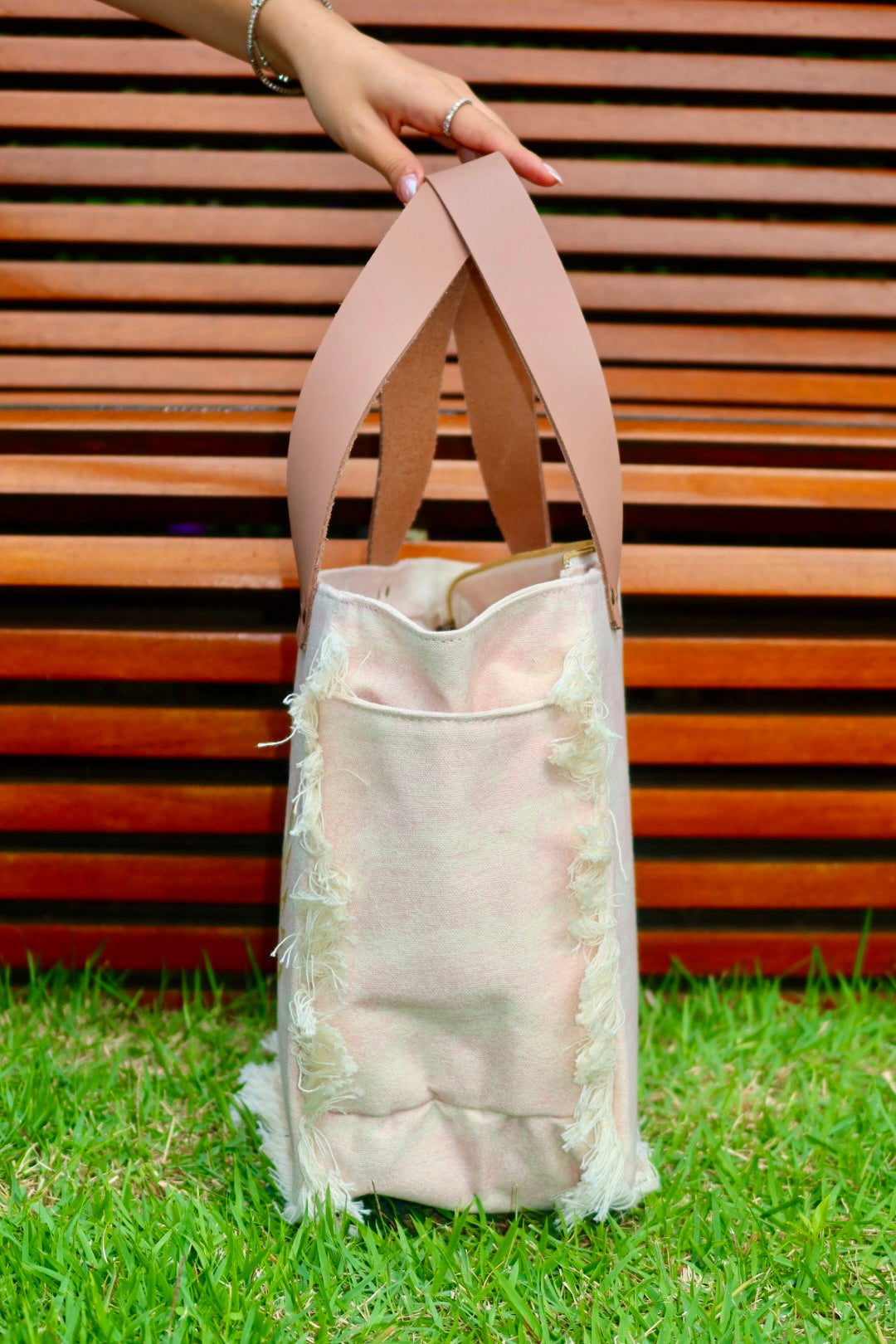 Contém 2 bolsos internos e 1 bolso externo lateral. Fechamento em zíper.