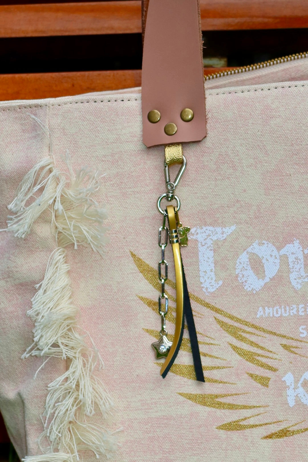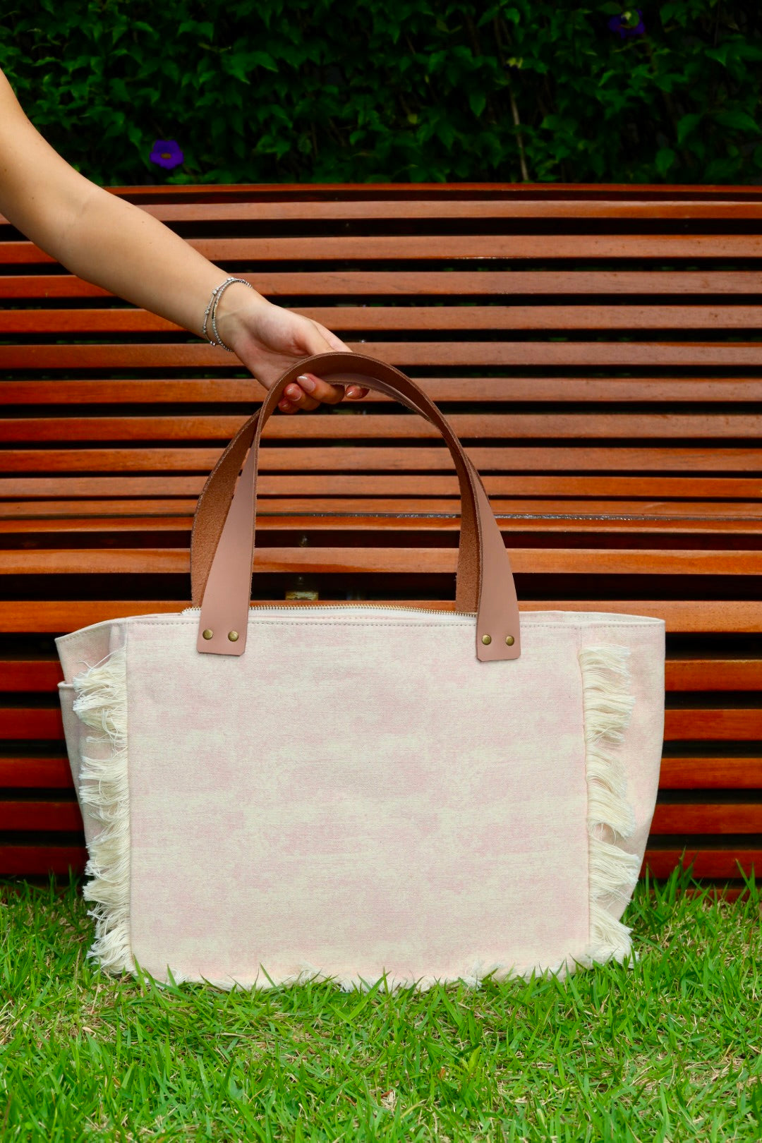 Bolsa média em lona de algodão estilo tote no modelo Nuna na cor lilac, com estampa em silk dourado e branco e alças de couro legítimo em bege.
