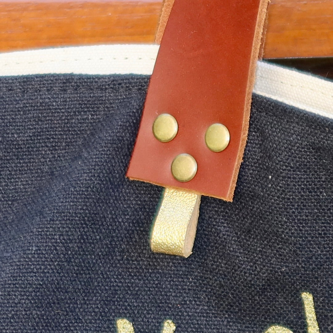 Bolsa grande estilo sacola no modelo Wallow na cor jeans preto, com estampa em silk dourado e branco, e alças de couro legítimo em marrom.