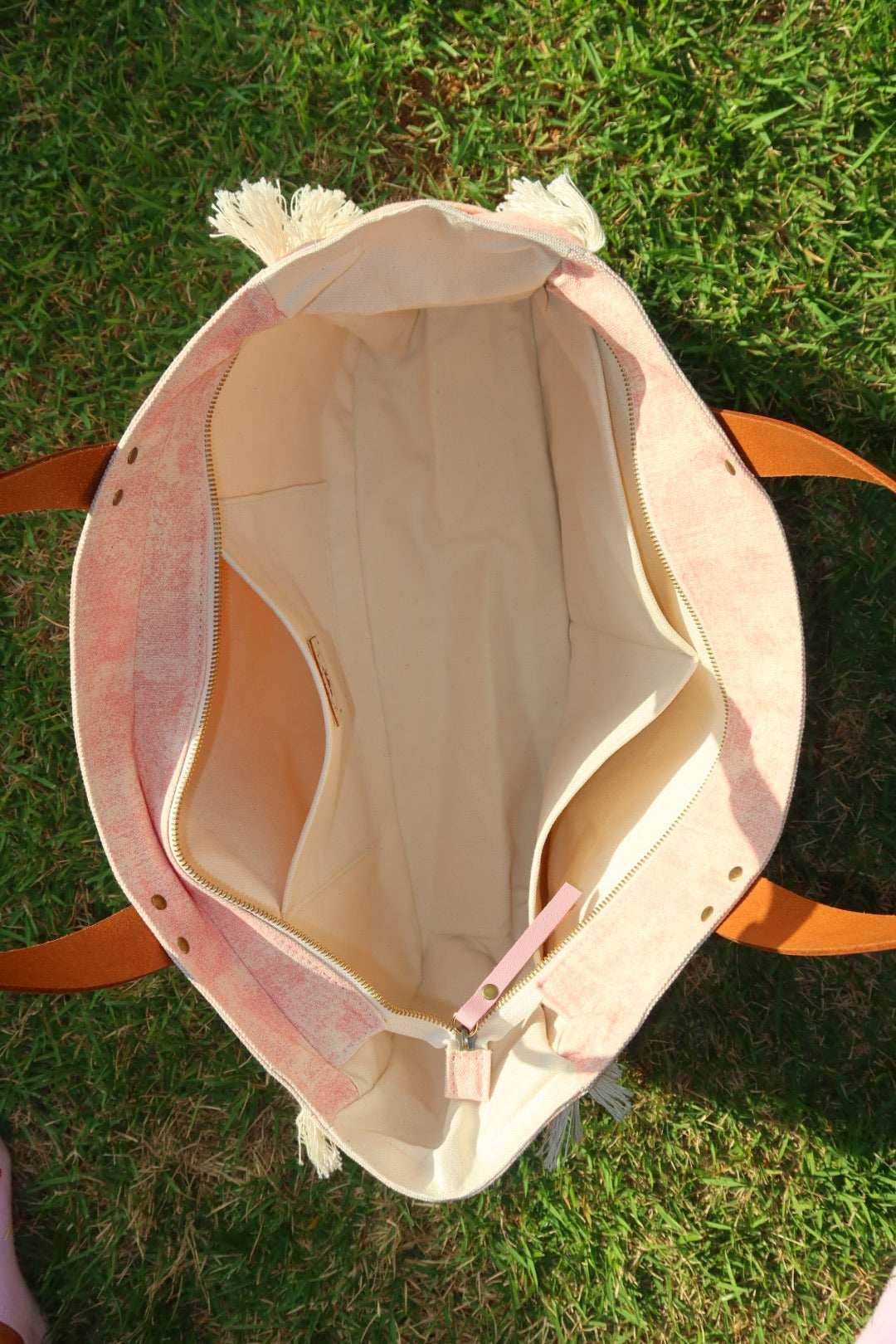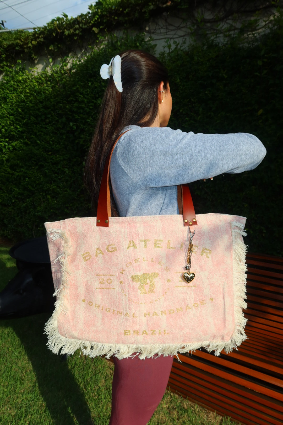 Bolsa grande estilo sacola no modelo Wallow na cor rosa, com estampa em silk dourado, e alças de couro legítimo em marrom.