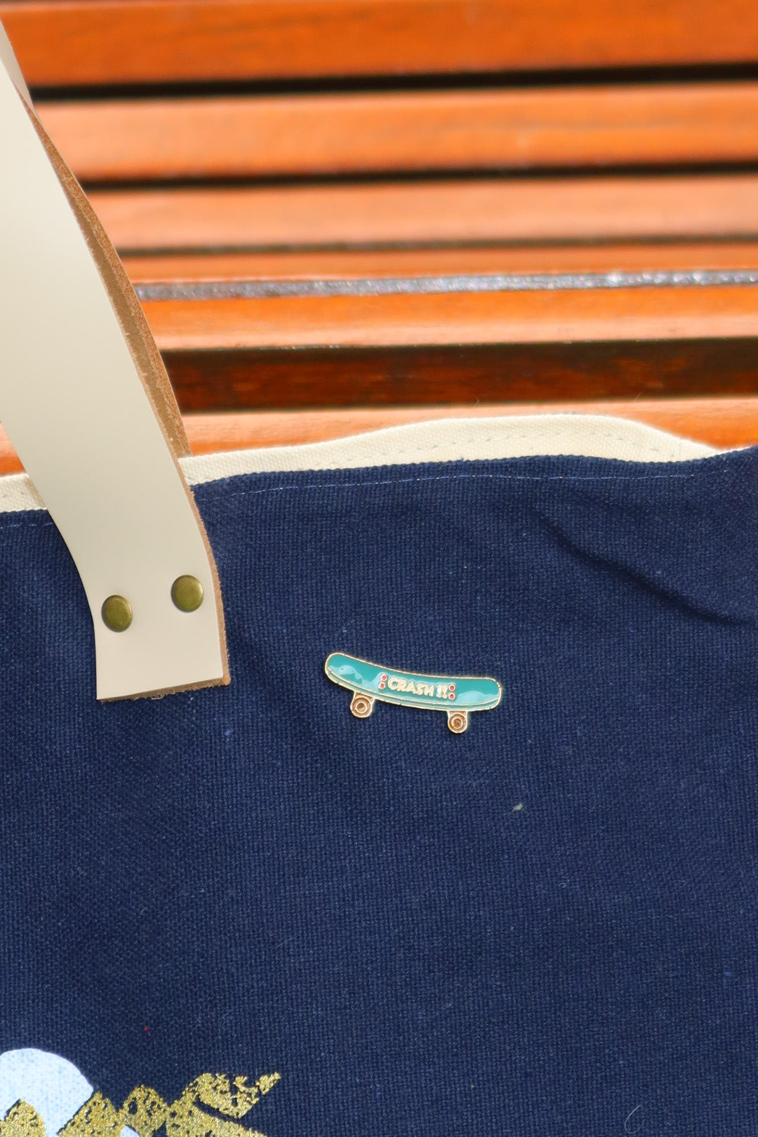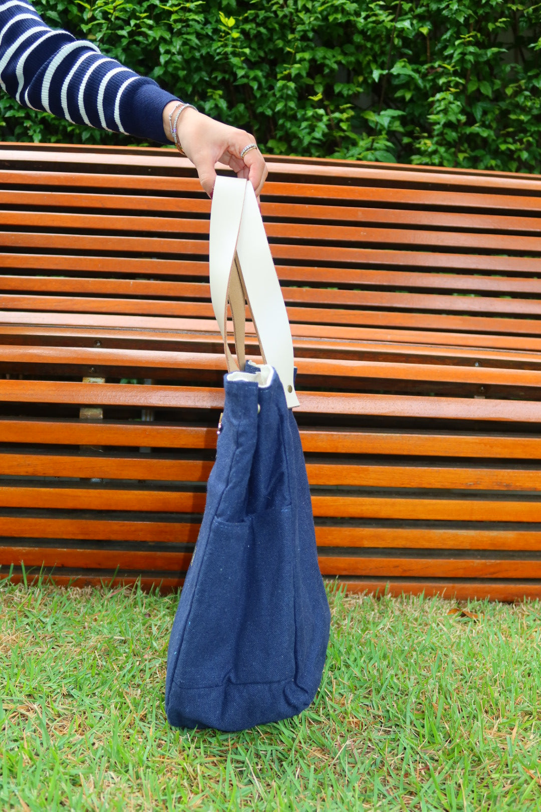 Bolsa grande estilo sacola no modelo Wallow na cor marinho, com estampa em silk branco e dourado, e alças de couro legítimo em off white.