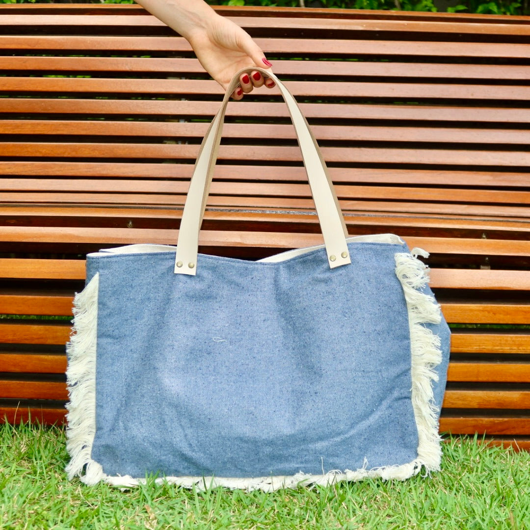 Bolsa grande estilo sacola no modelo Wallow na cor jeans claro, com estampa em silk rosa e vinho, e alças de couro legítimo em branco.