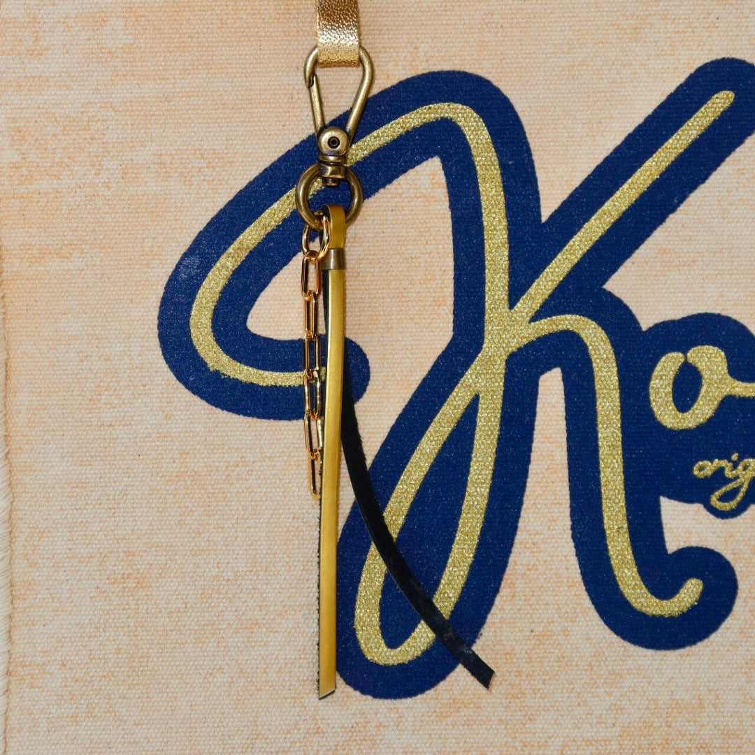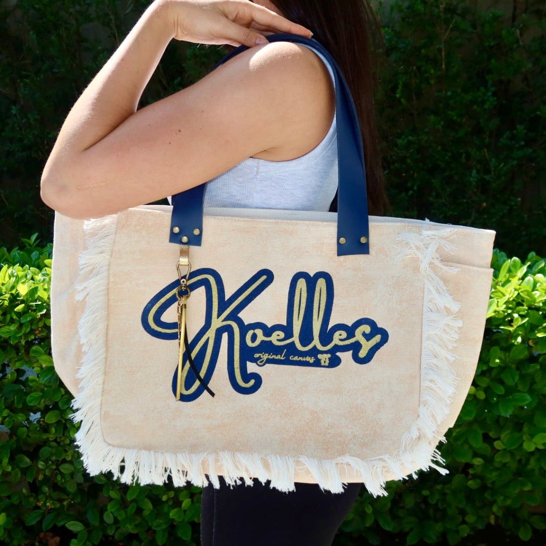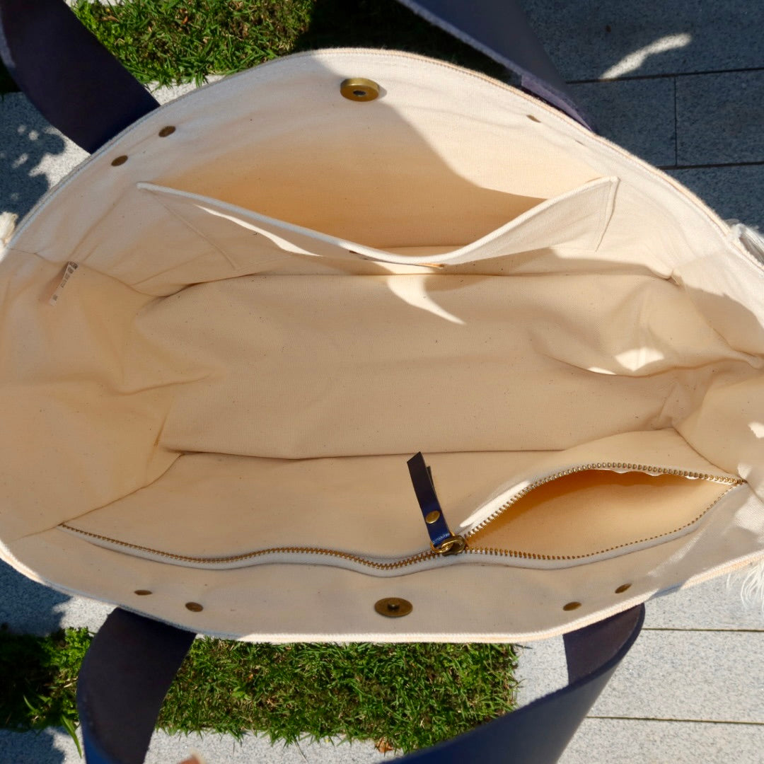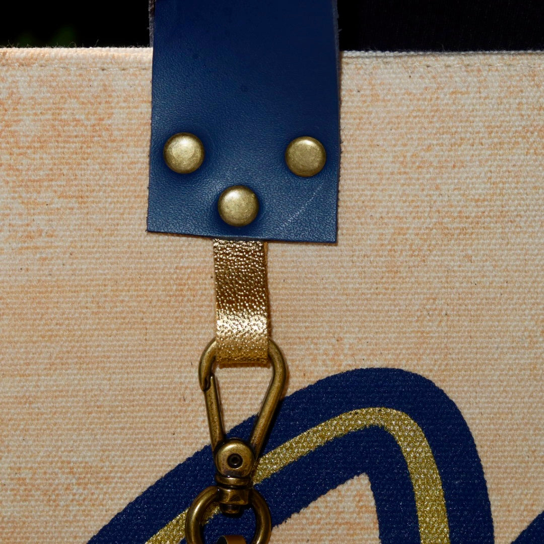 Bolsa média em lona de algodão estilo tote no modelo Nuna na cor bege, com estampa em silk marinho e dourado, e alças de couro legítimo em marinho.