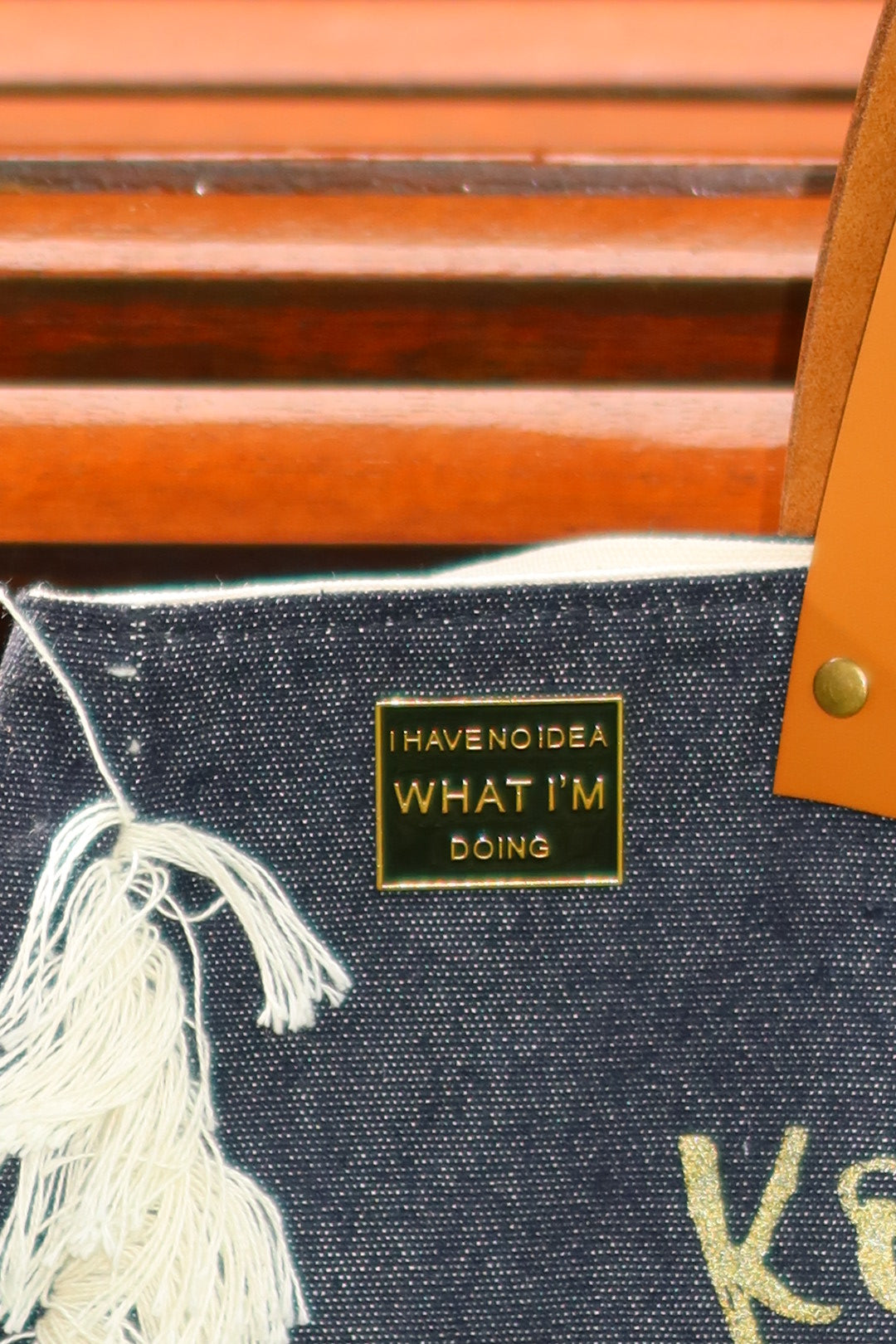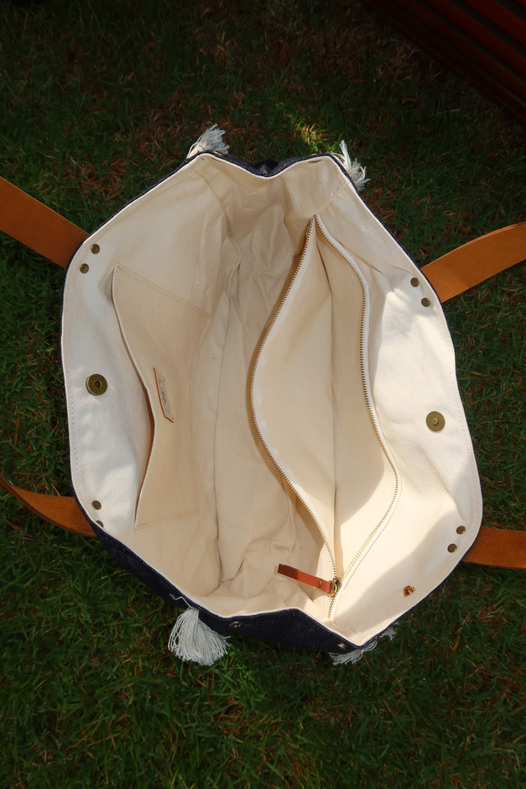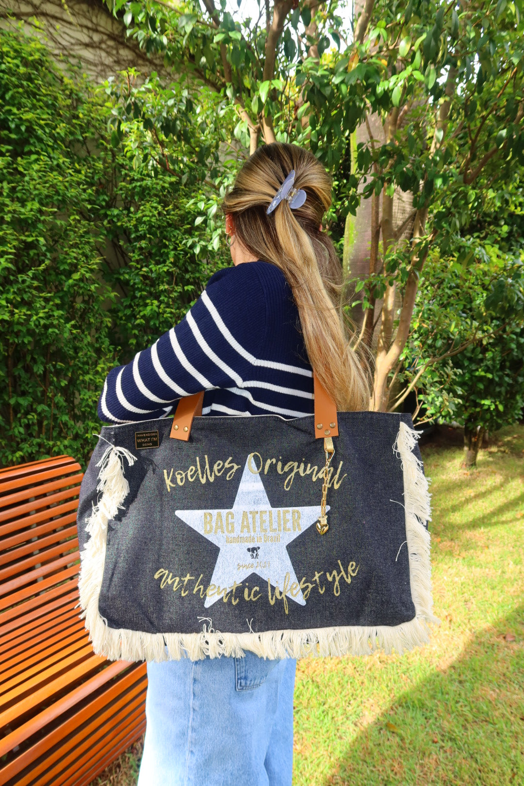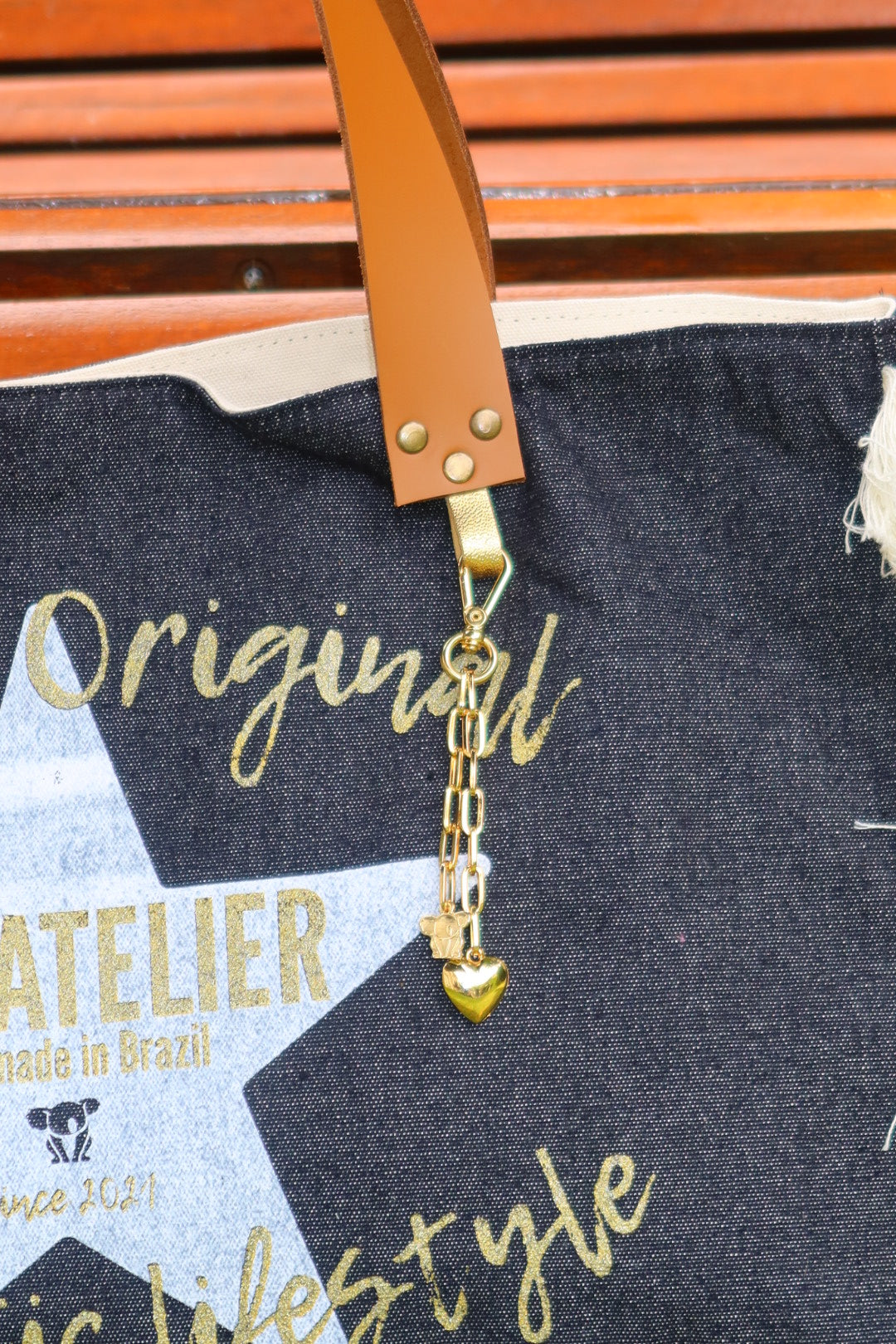 Bolsa grande estilo sacola no modelo Wallow na cor jeans preto, com estampa em silk dourado e branco, e alças de couro legítimo em caramelo.
