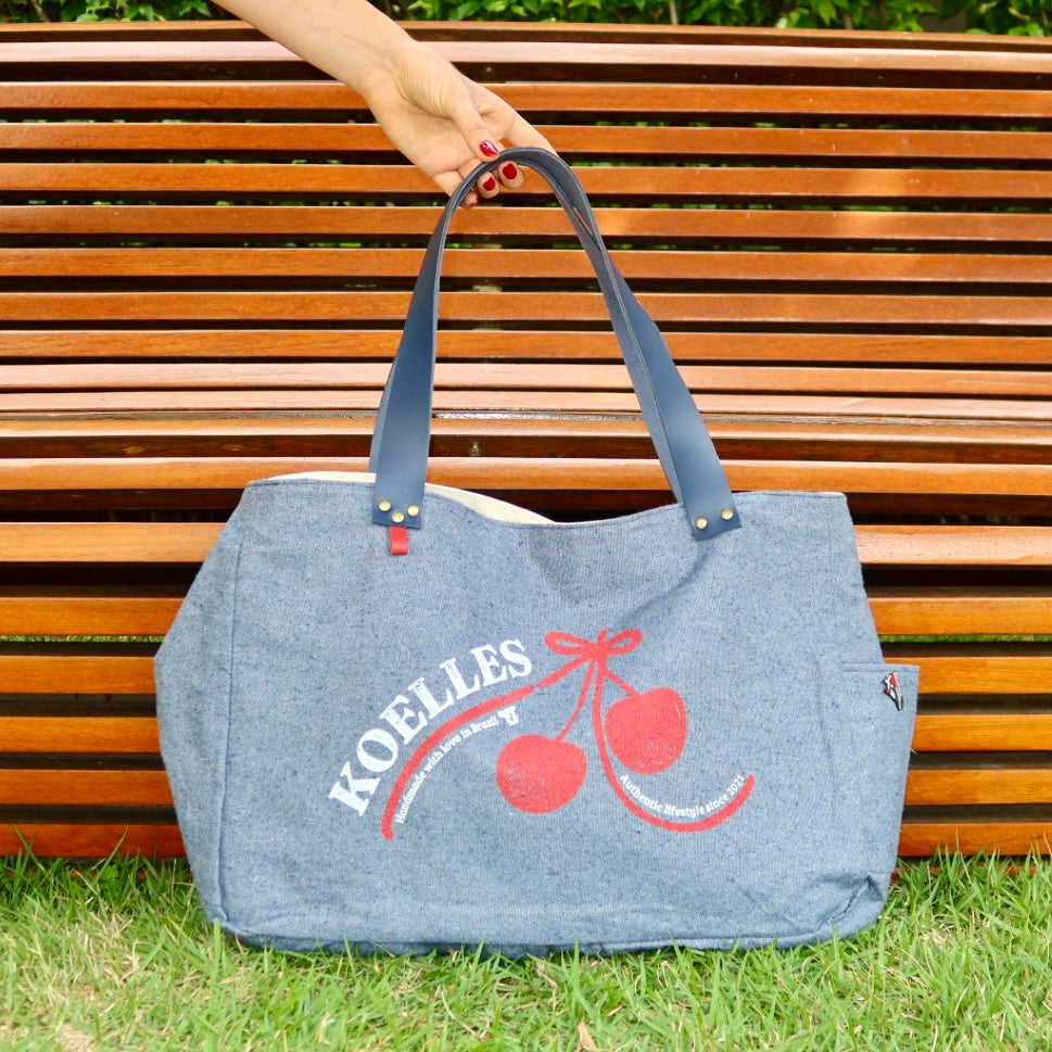 Bolsa grande estilo sacola no modelo Wallow na cor jeans claro, com estampa em silk vermelho e branco, e alças de couro legítimo em marinho.