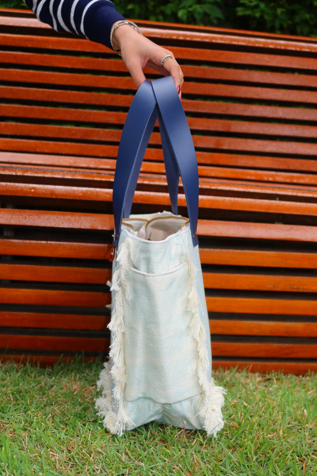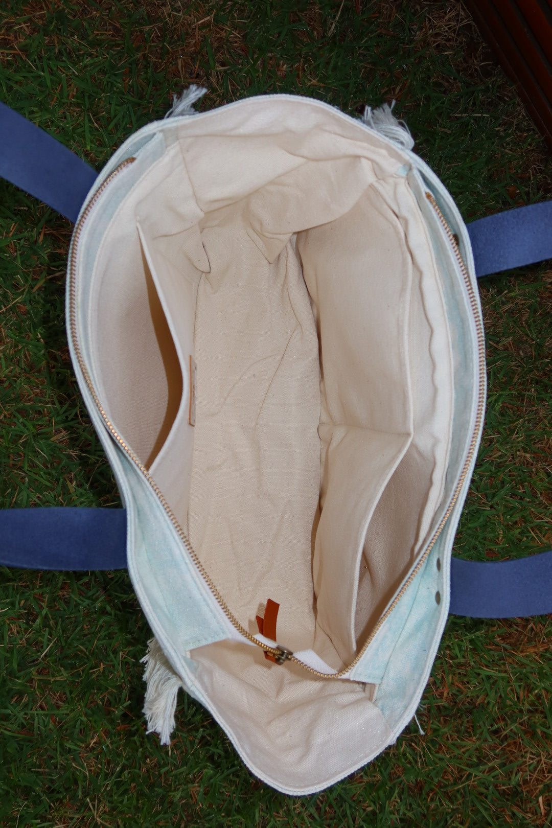 Bolsa média em lona de algodão estilo tote no modelo Nuna na cor aqua, com estampa em silk branco e marinho e alças de couro legítimo em marinho.