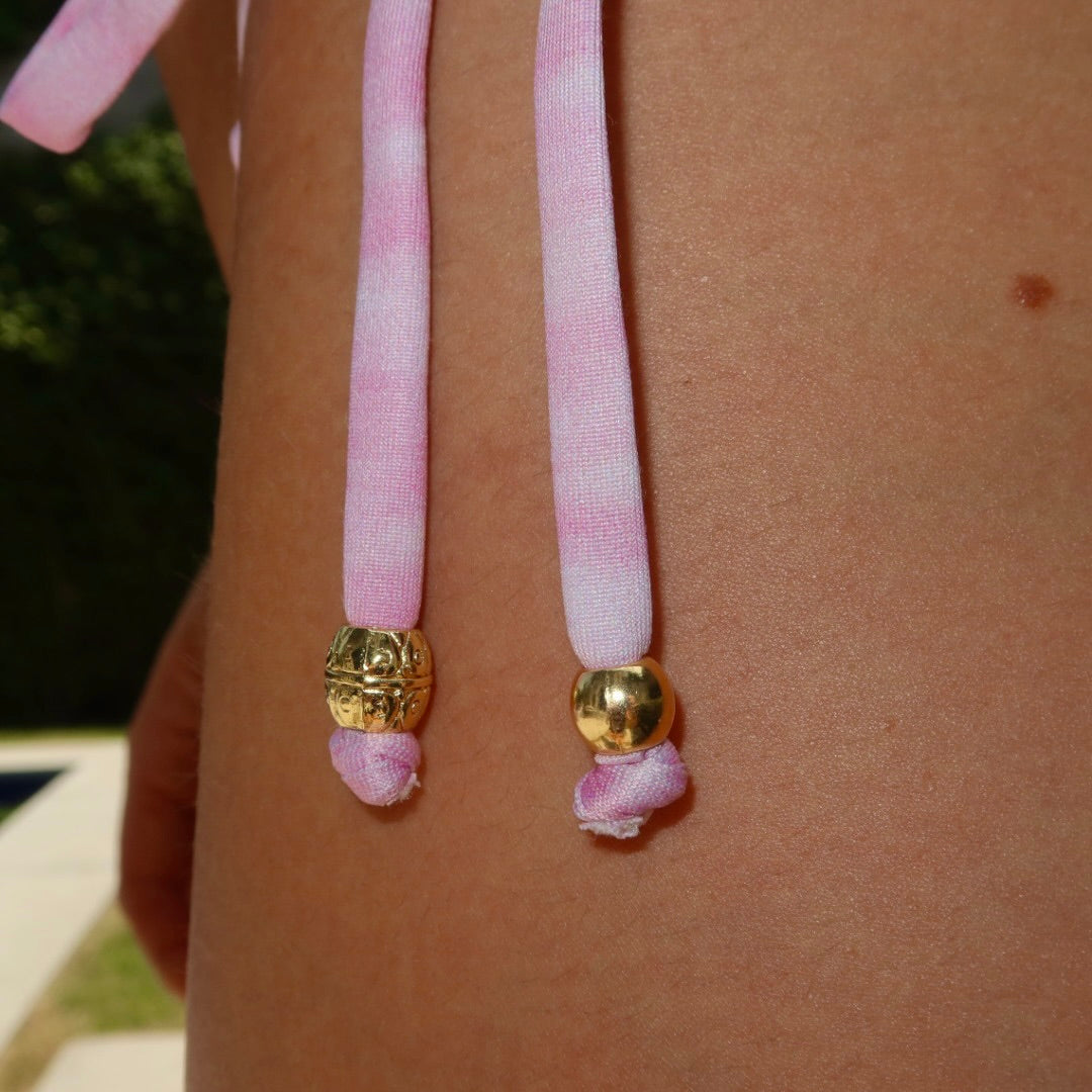 Biquini no modelo cortina com top em alça reta, que é segurada nas costas invés de no pescoço. Feito em lycra na estampa listras na cor rosa. Contém três miçangas no centro do top e duas de cada lado na amarração da calcinha.