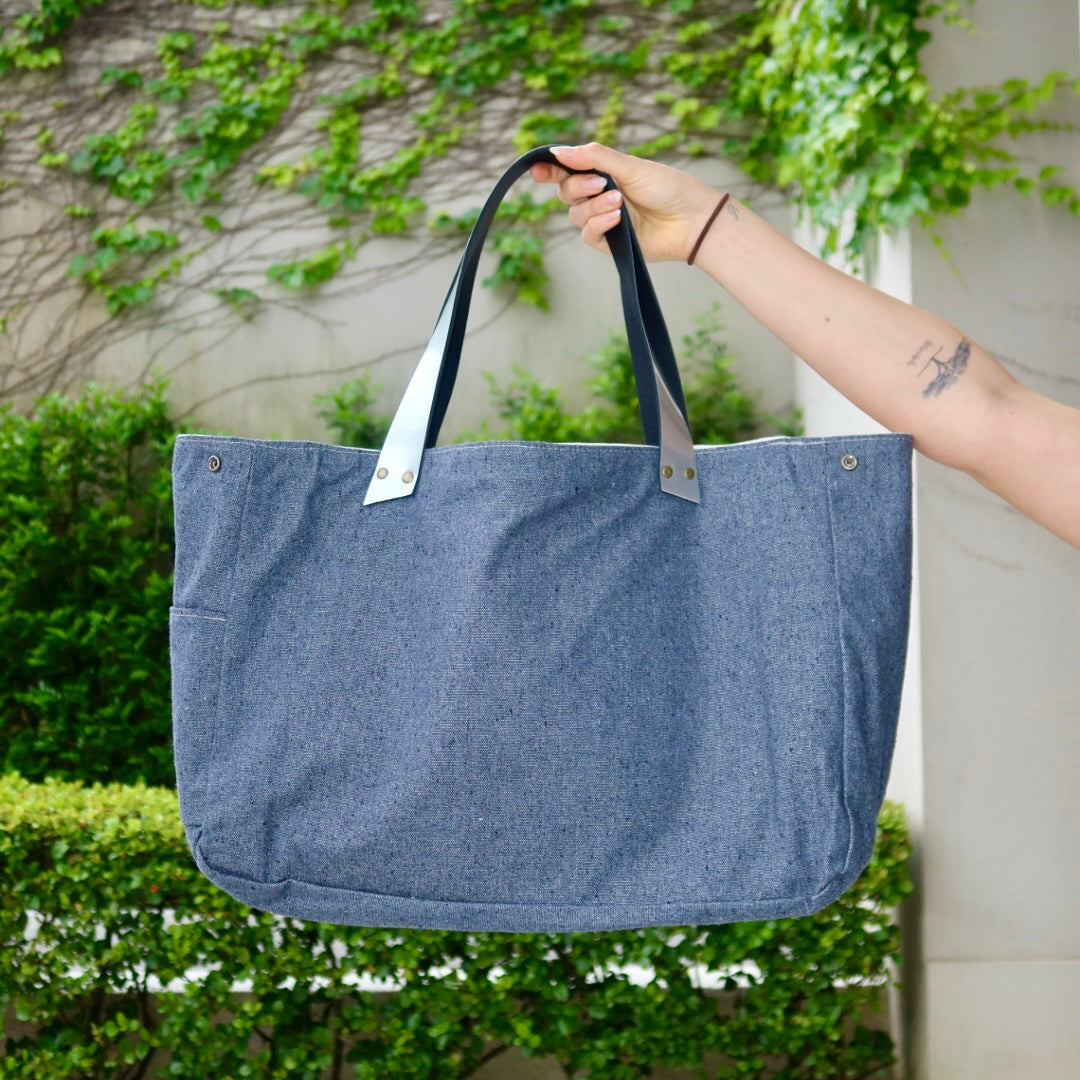 Bolsa grande estilo sacola no modelo Wallow na cor cinza, com estampa em silk prata e marinho, e alças de couro legítimo em prata.