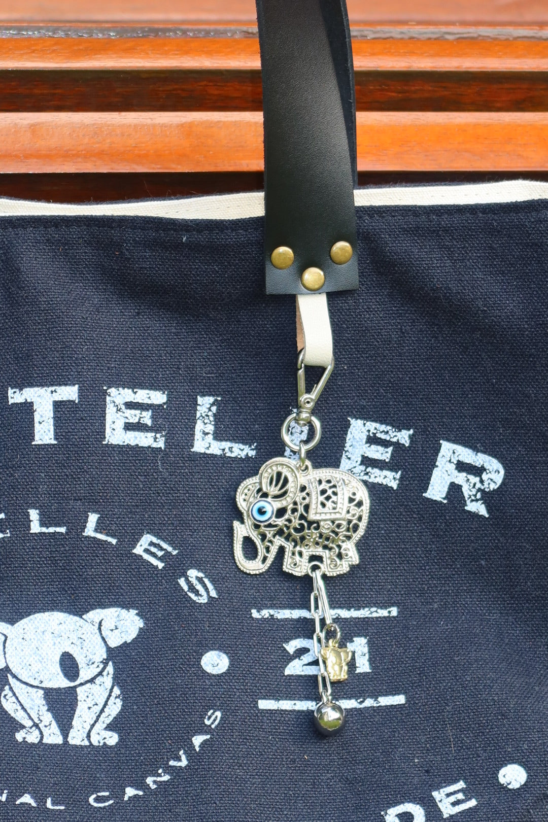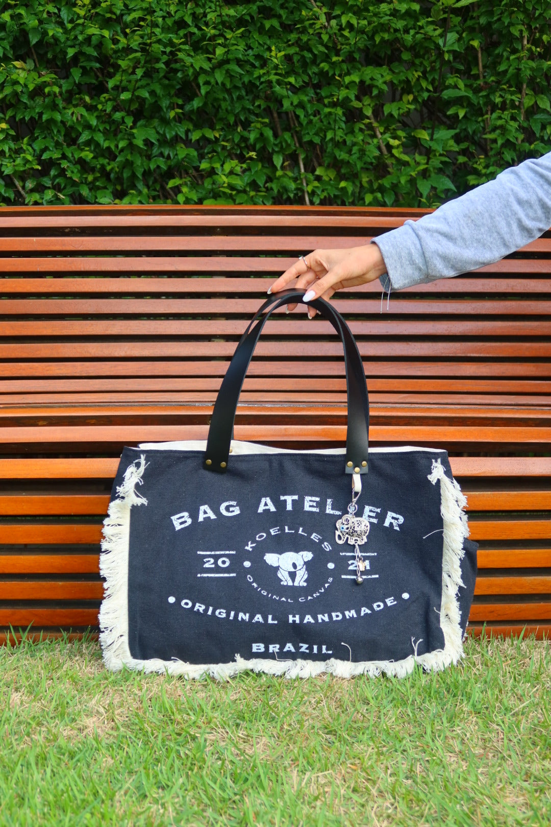 Bolsa grande estilo sacola no modelo Wallow na cor preto, com estampa em silk branco e alças de couro legítimo em preto.