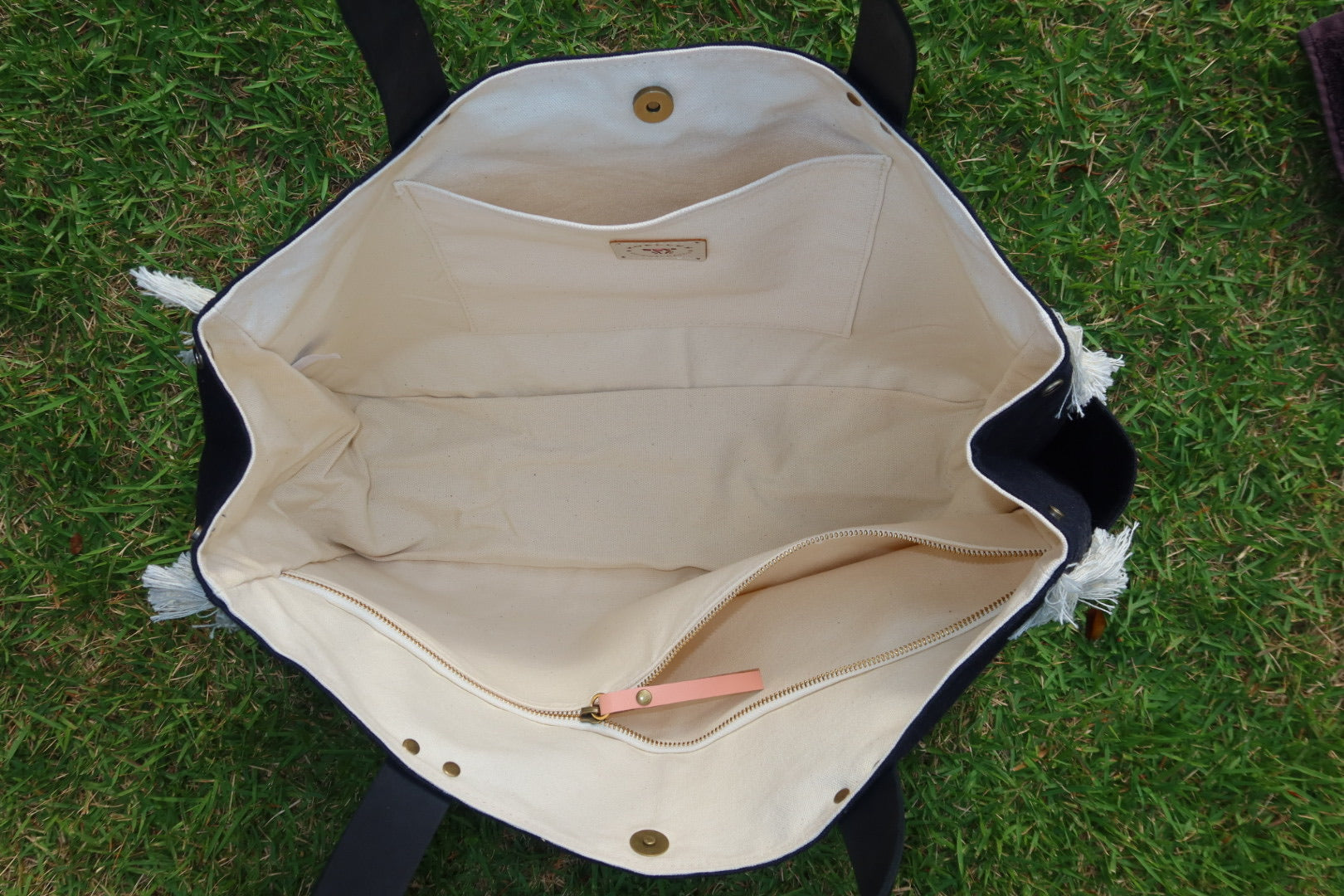Contém 2 bolsos internos, um deles com fechamento em zíper, e um bolso externo lateral. Fechamento por botão de imã.