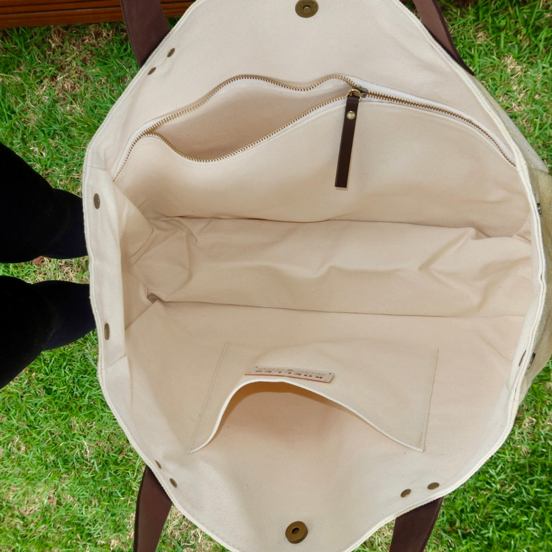 Bolsa grande estilo sacola no modelo Wallow na cor amarela, com estampa em silk branco, e alças de couro legítimo em marrom escuro.