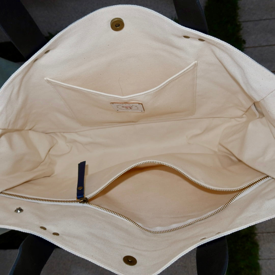Bolsa grande estilo sacola no modelo Wallow na cor azul, com estampa em silk branco e marinho, e alças de couro legítimo em prata.