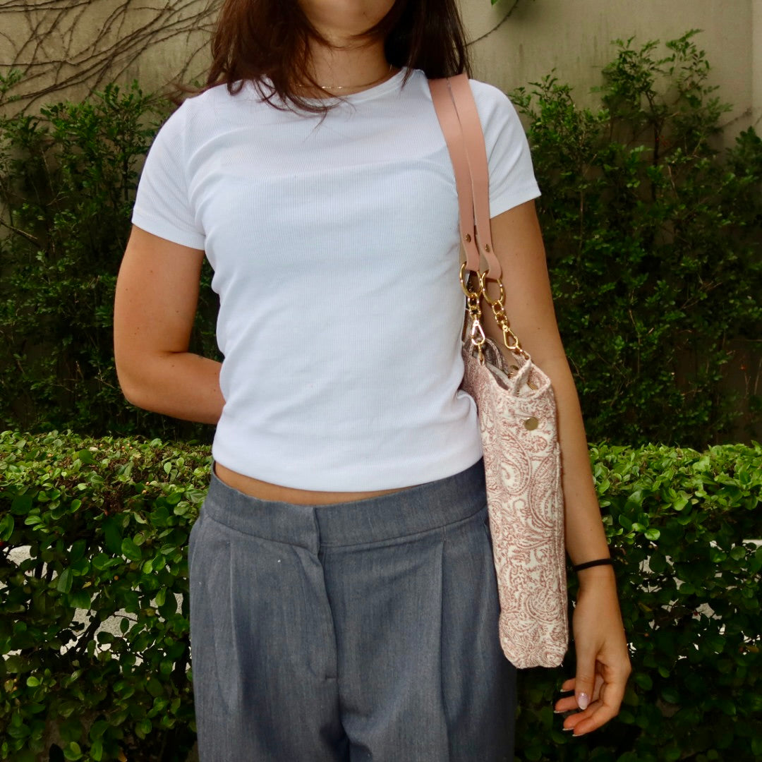 Bolsa média estilo tote em lona de algodão no modelo Katrin na cor arabesque terracota e alça de corrente dourada e couro legítimo em rosa claro.
