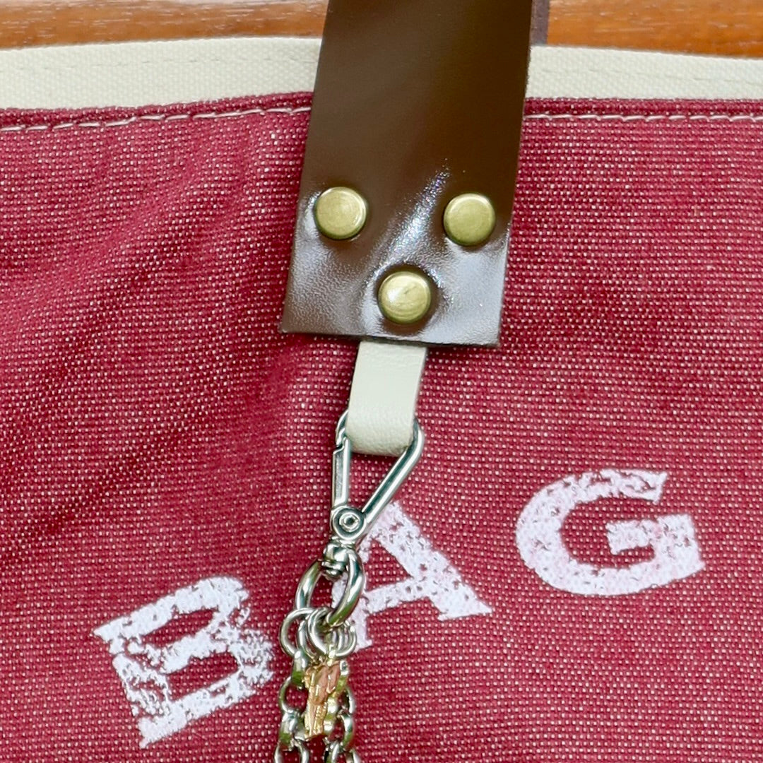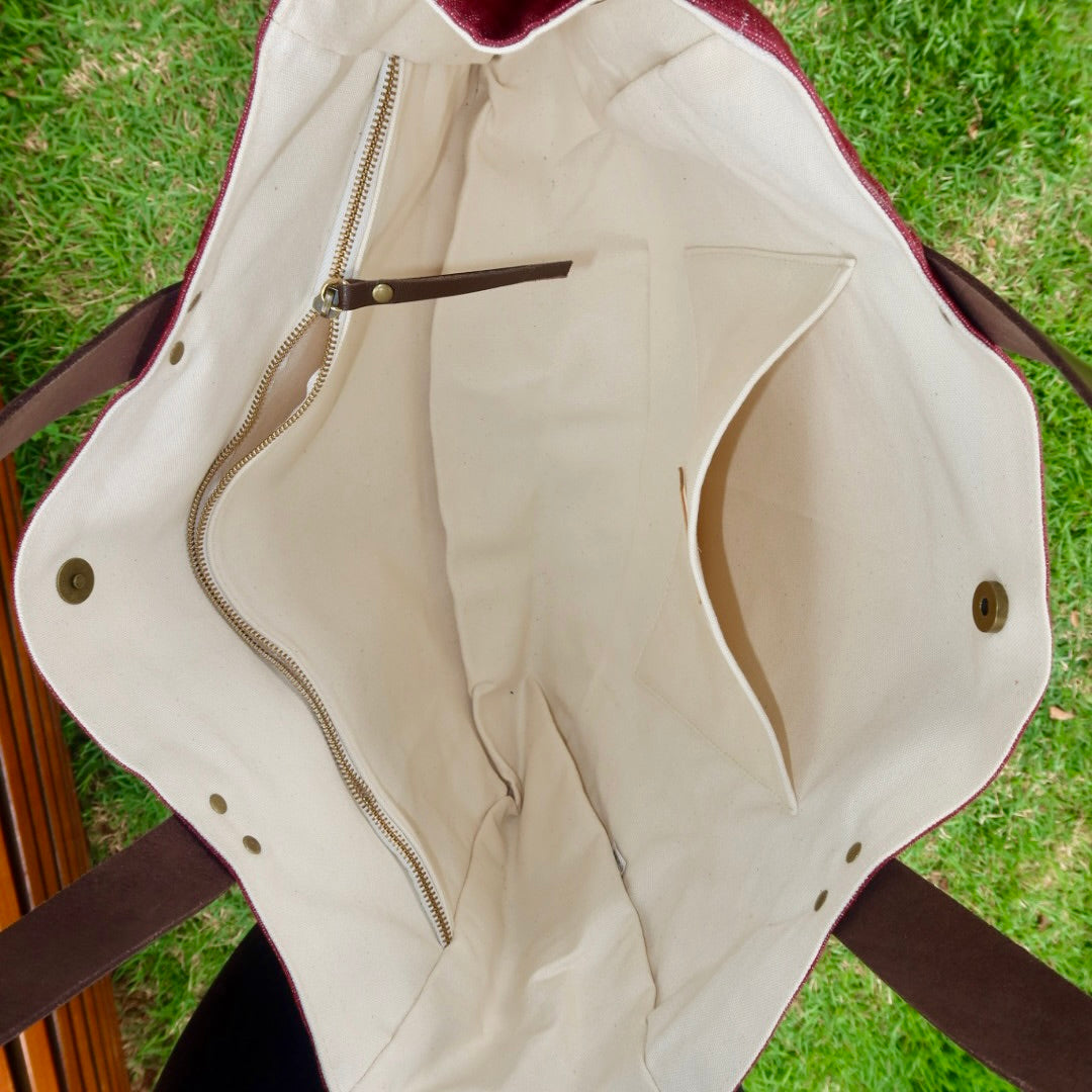 Bolsa grande estilo sacola no modelo Wallow na cor vinho, com estampa em silk branco, e alças de couro legítimo em marrom escuro envernizado.