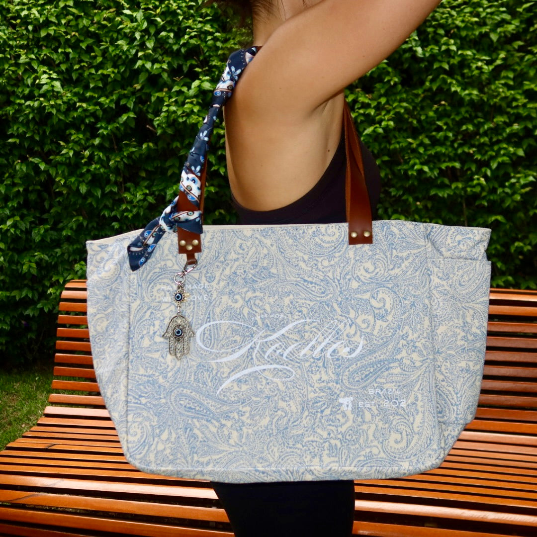 Bolsa média em lona de algodão estilo tote no modelo Nuna na cor arabesque azul, com estampa em silk branco, e alças de couro legítimo em marrom.