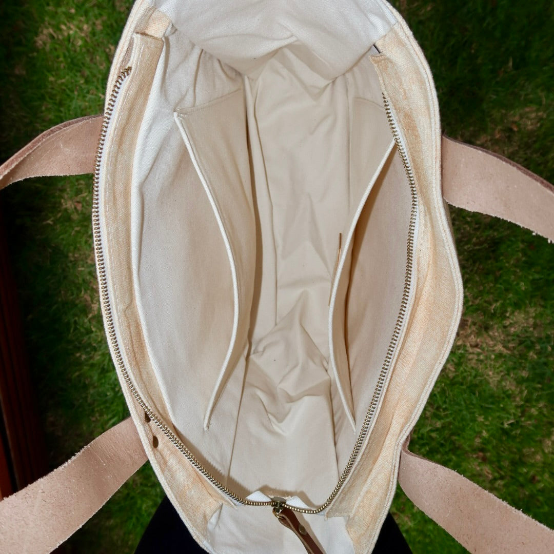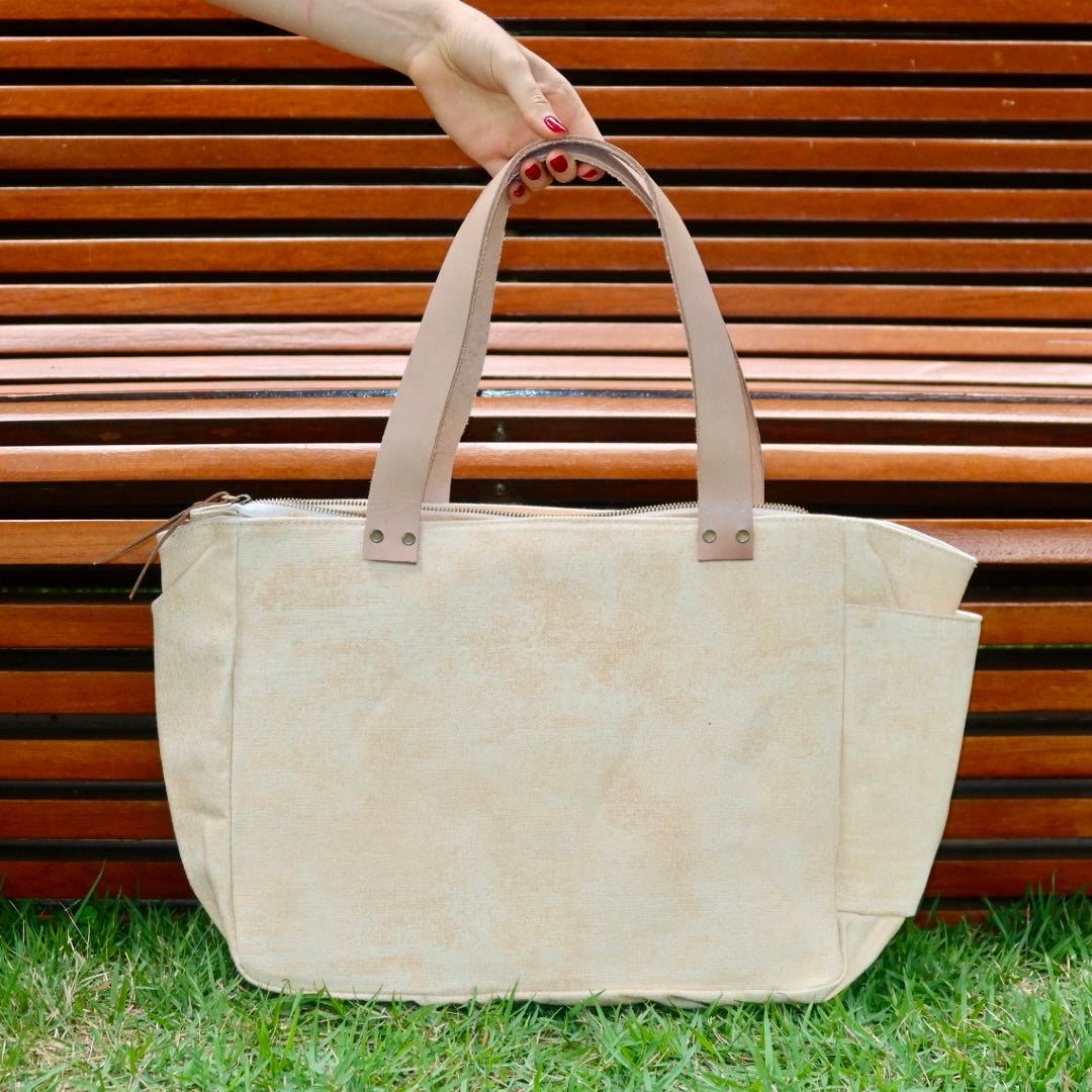 Contém 3 bolsos internos, e um bolso externo lateral. Fechamento em zíper.