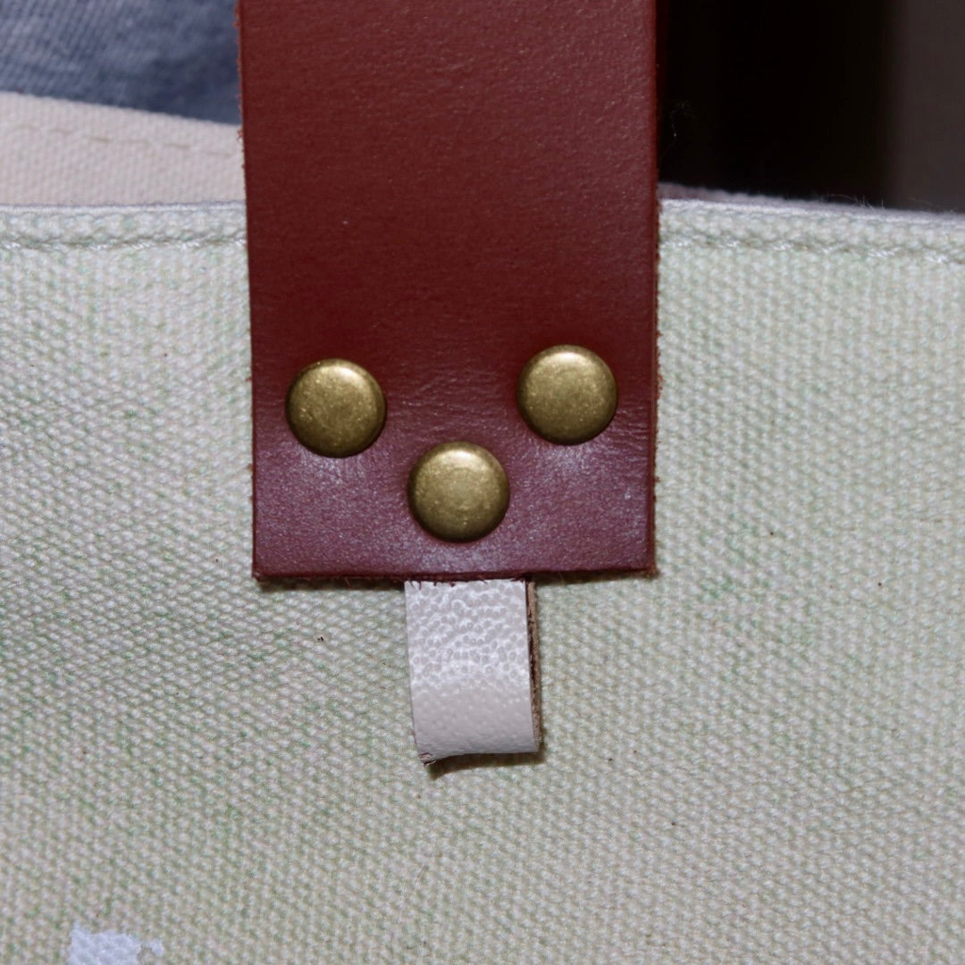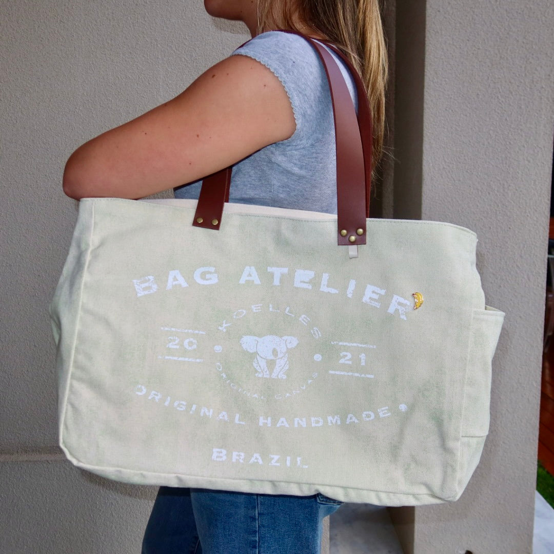 Bolsa grande estilo sacola no modelo Wallow na cor verde, com estampa em silk branco, e alças de couro legítimo em marrom.