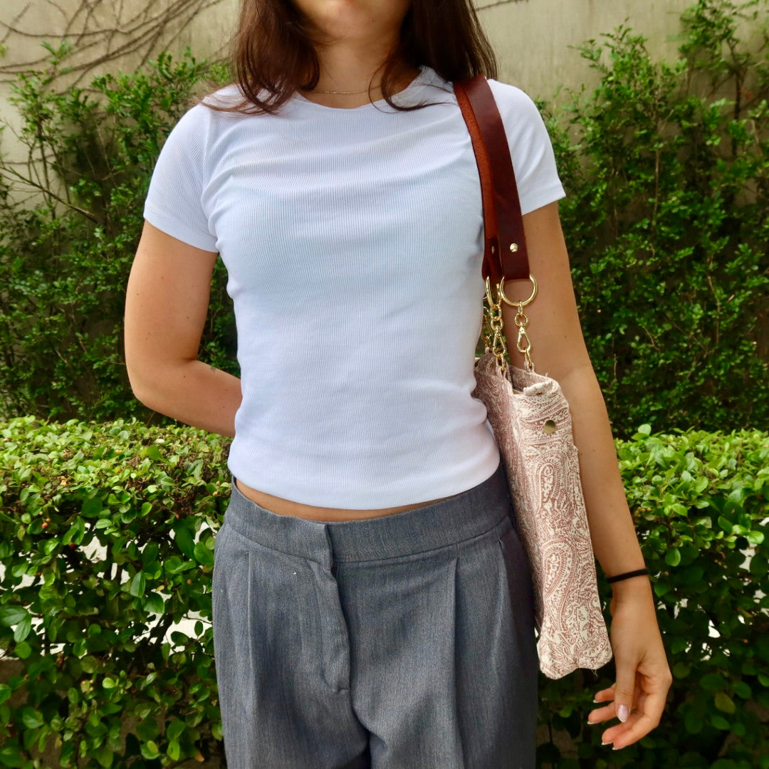 - Se necessário, lave na mão usando um pano com sabão neutro e água fria, sem molhar as alças e sem esfregar o tecido.